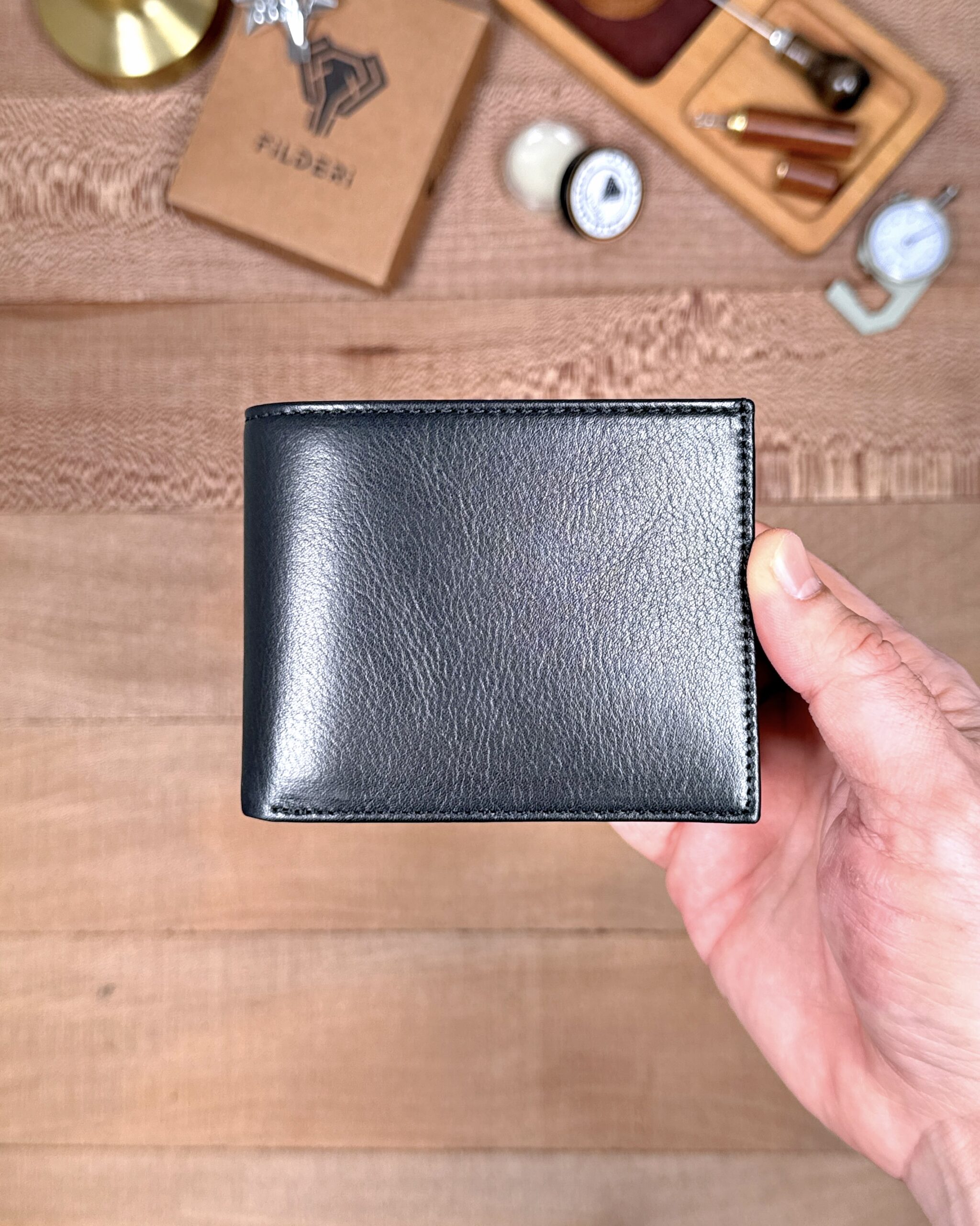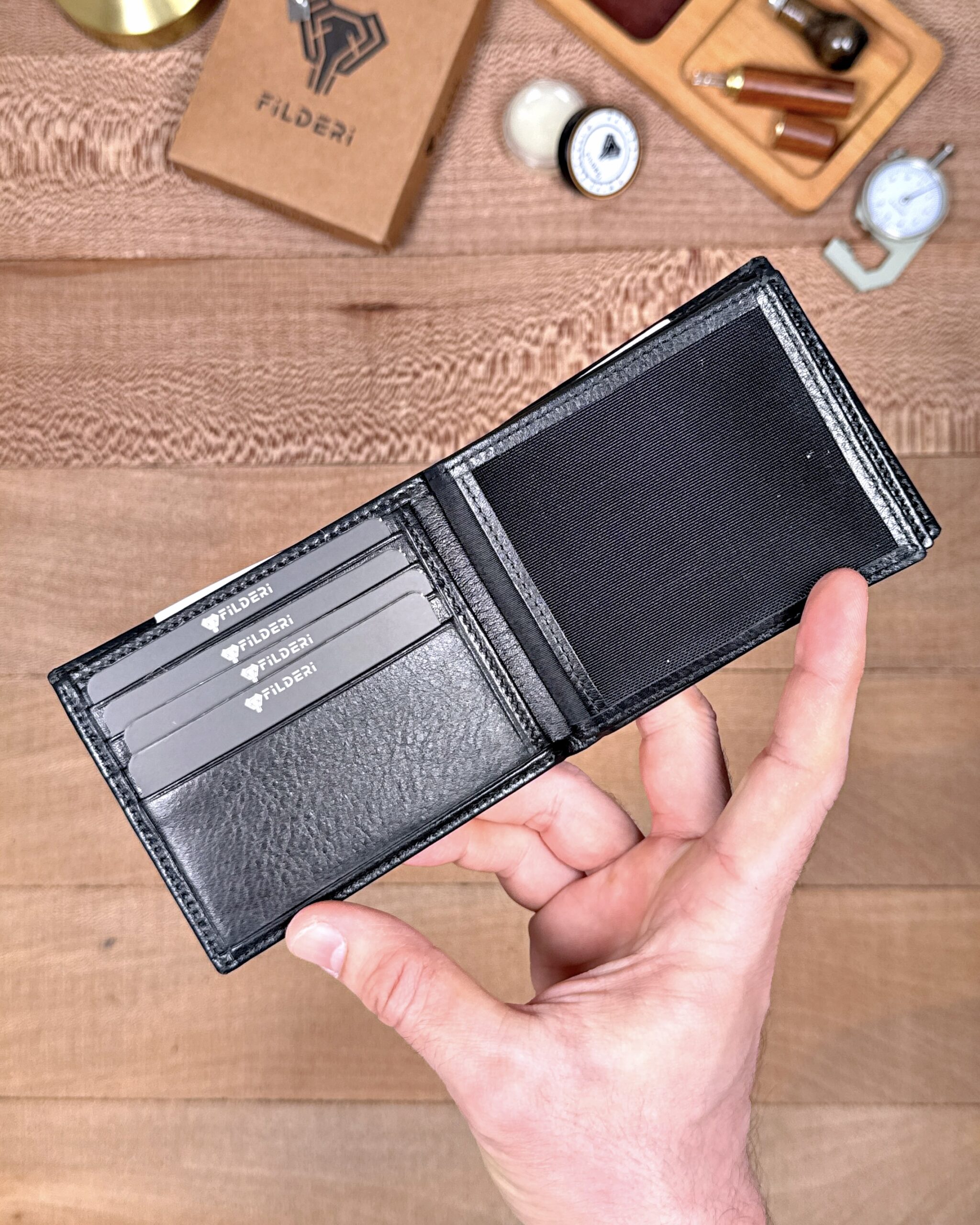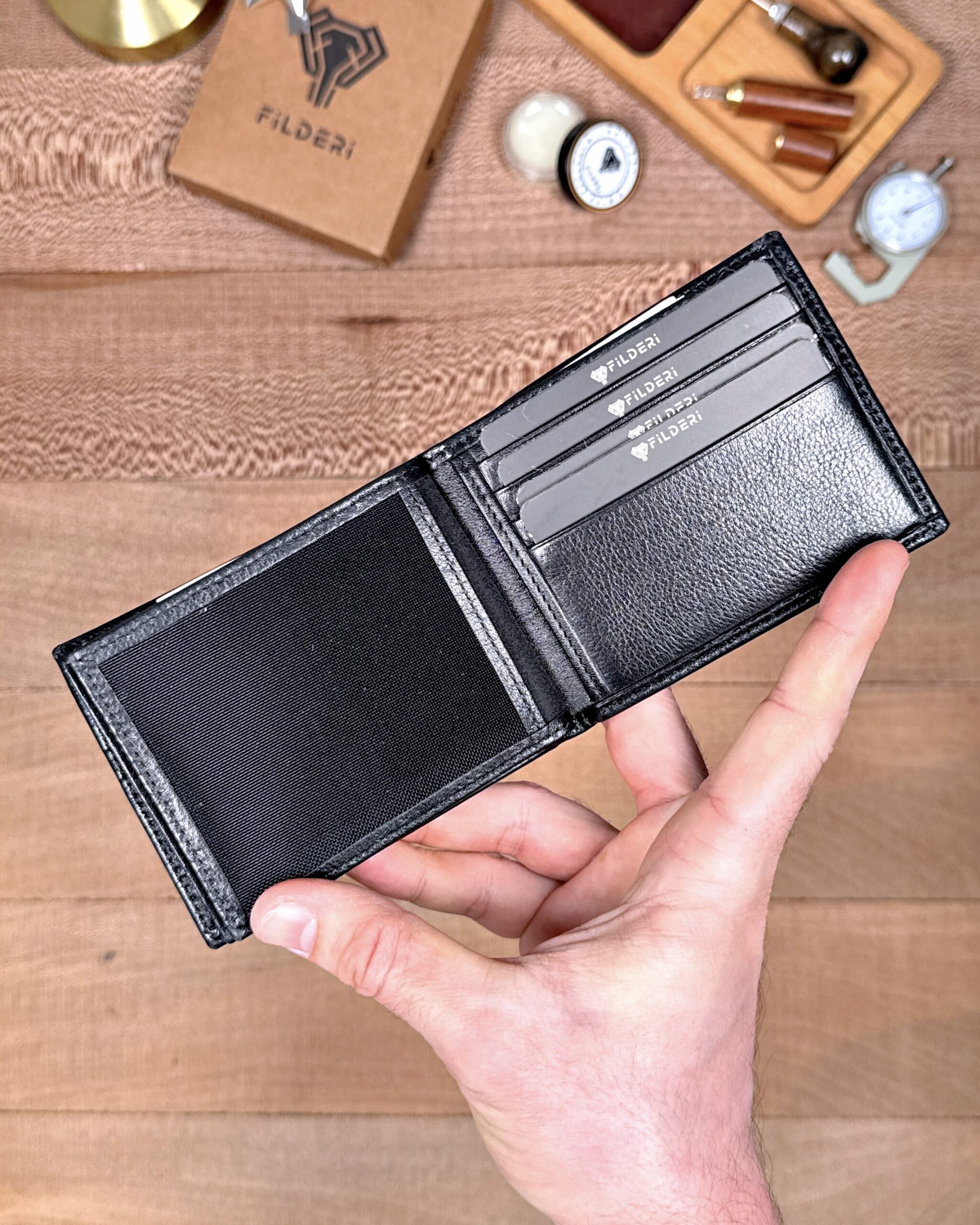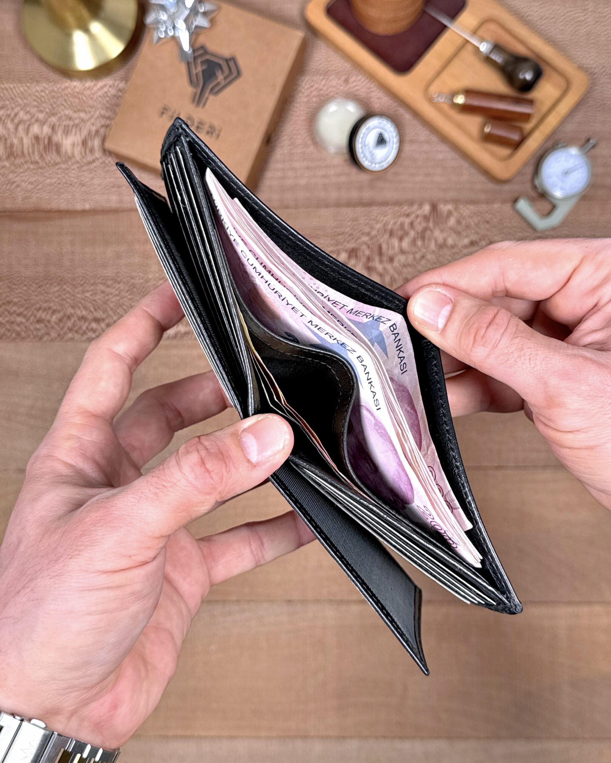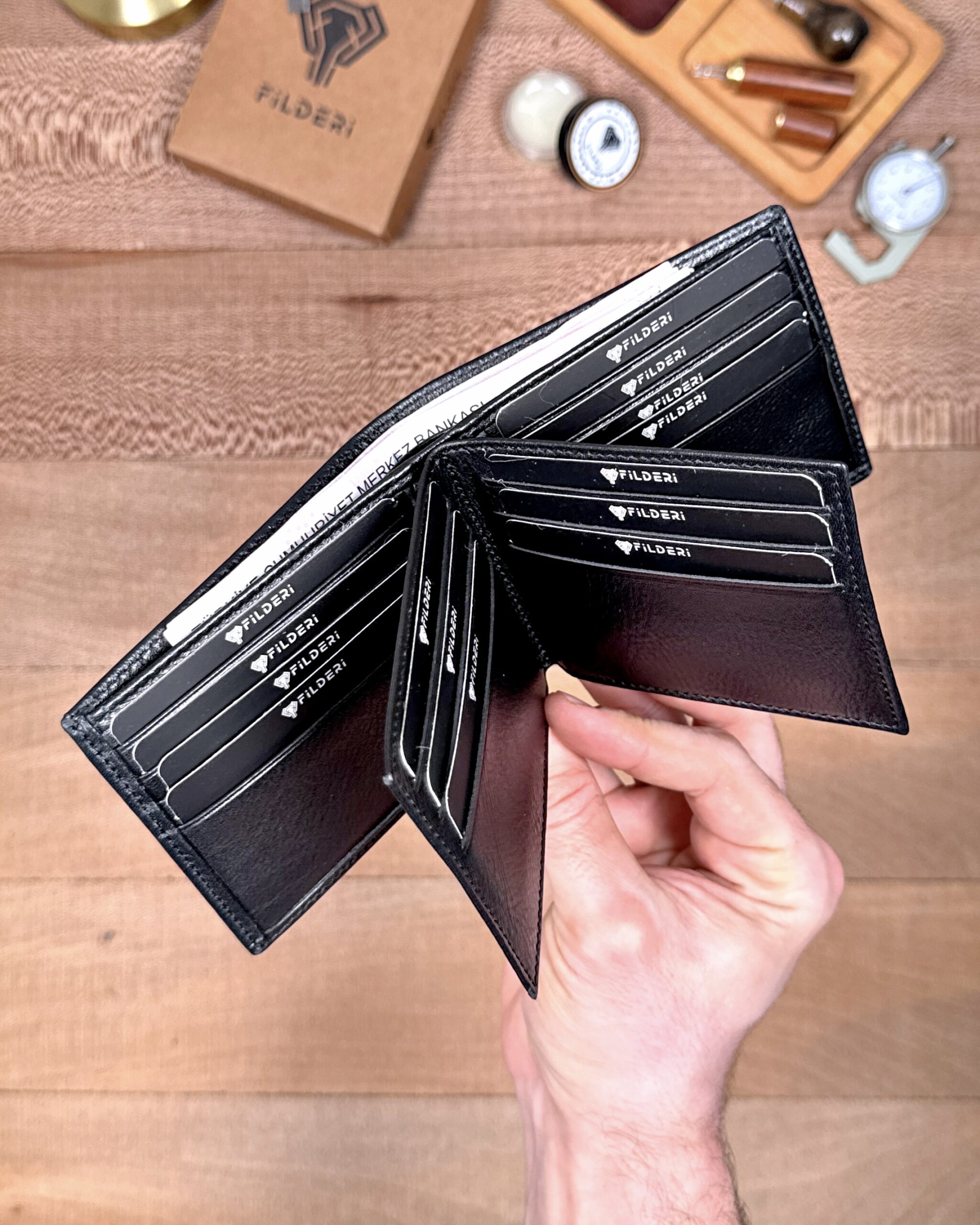 Derisi kaliteli, elde şık duruyor. Yeteri kadar kartlık gözü var, kağıt ve madeni paralar için kullanım kolay, telefon rahat sığıyor.