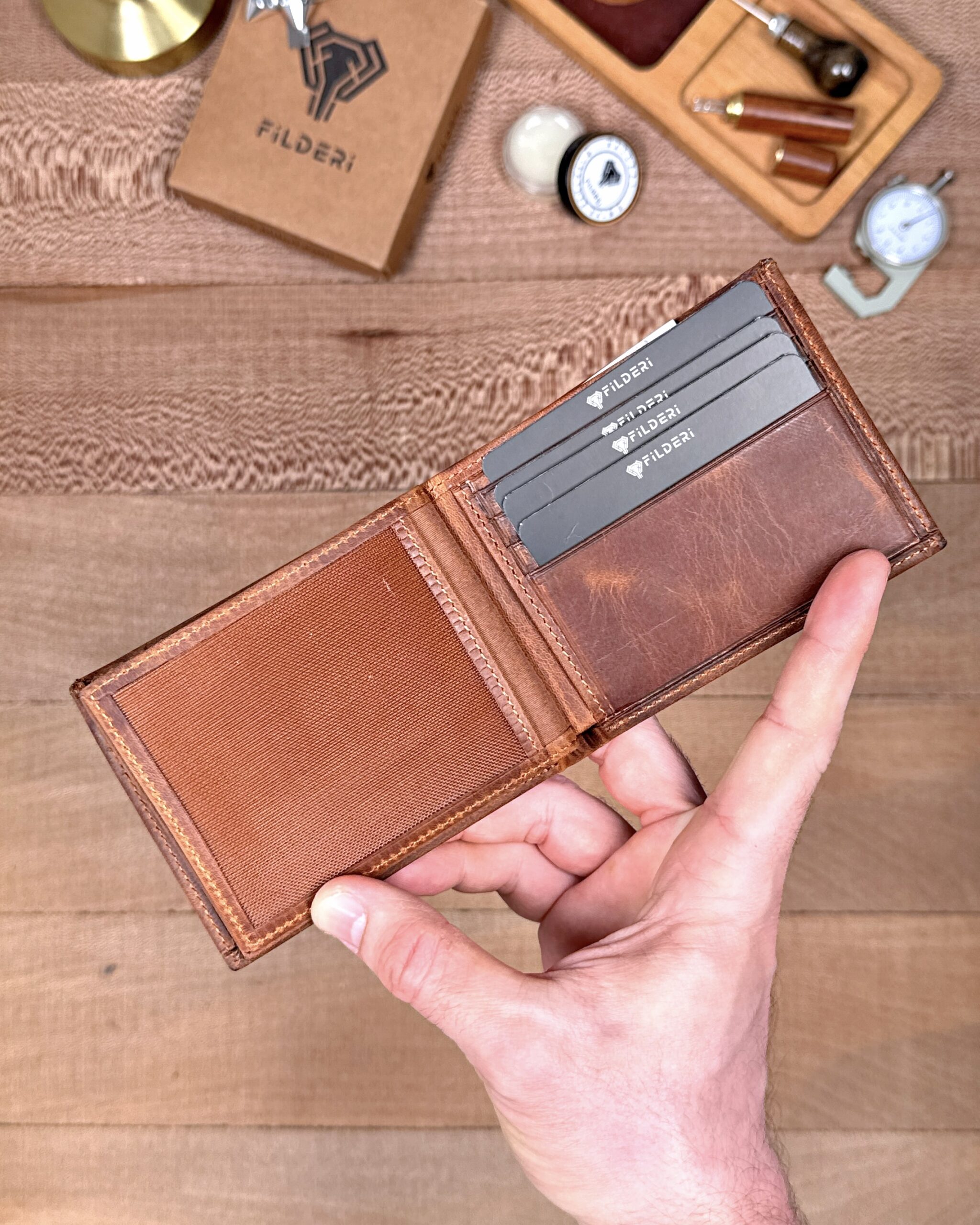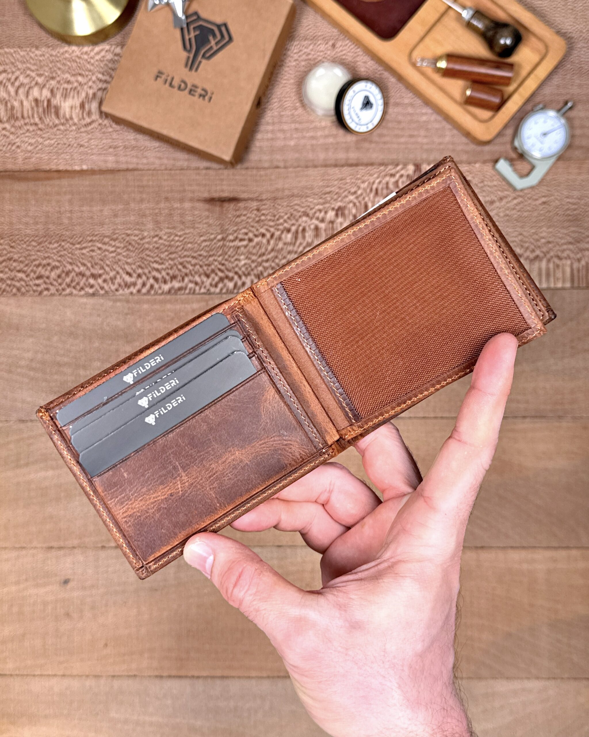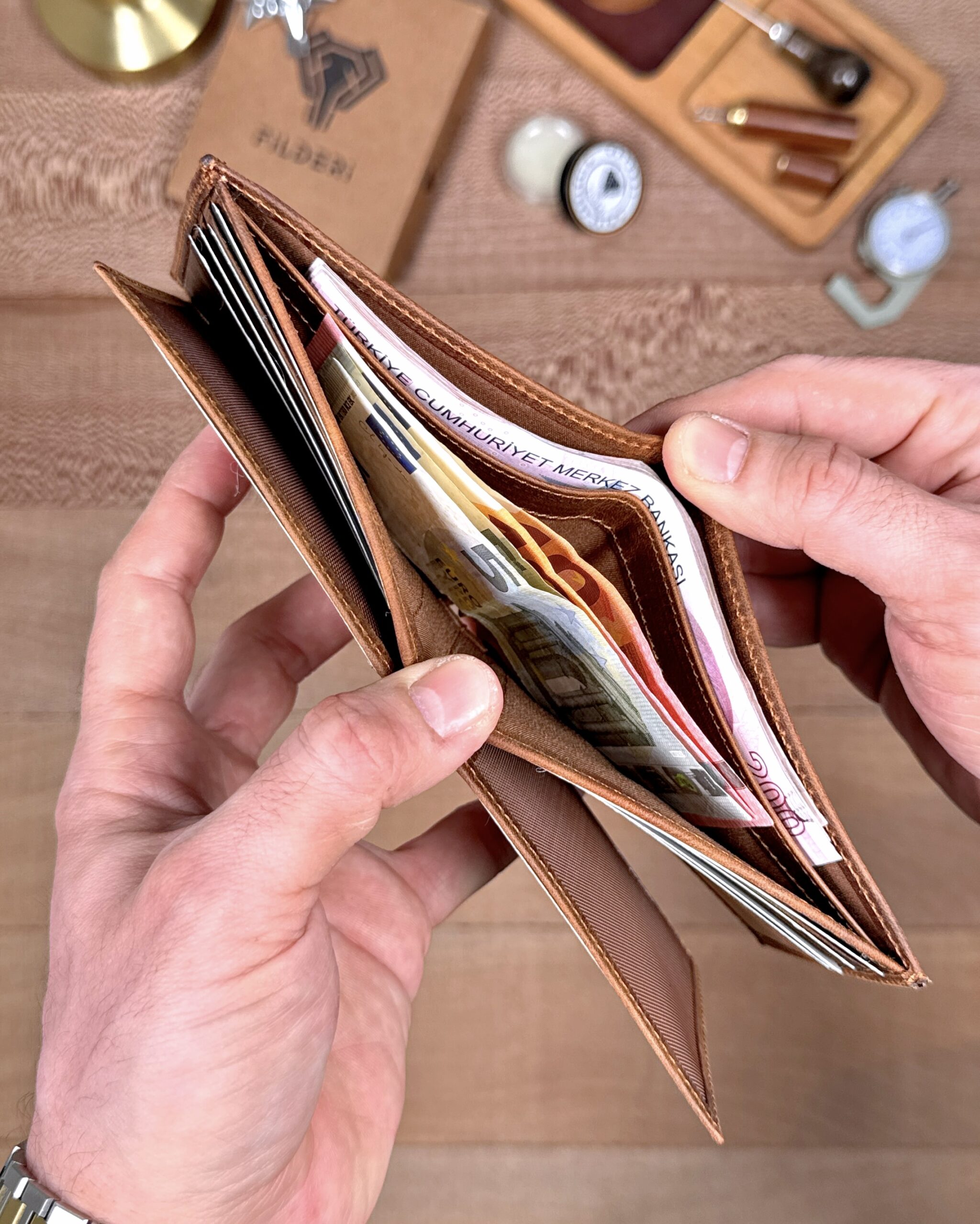 Derisi kaliteli, elde şık duruyor. Yeteri kadar kartlık gözü var, kağıt ve madeni paralar için kullanım kolay, telefon rahat sığıyor.