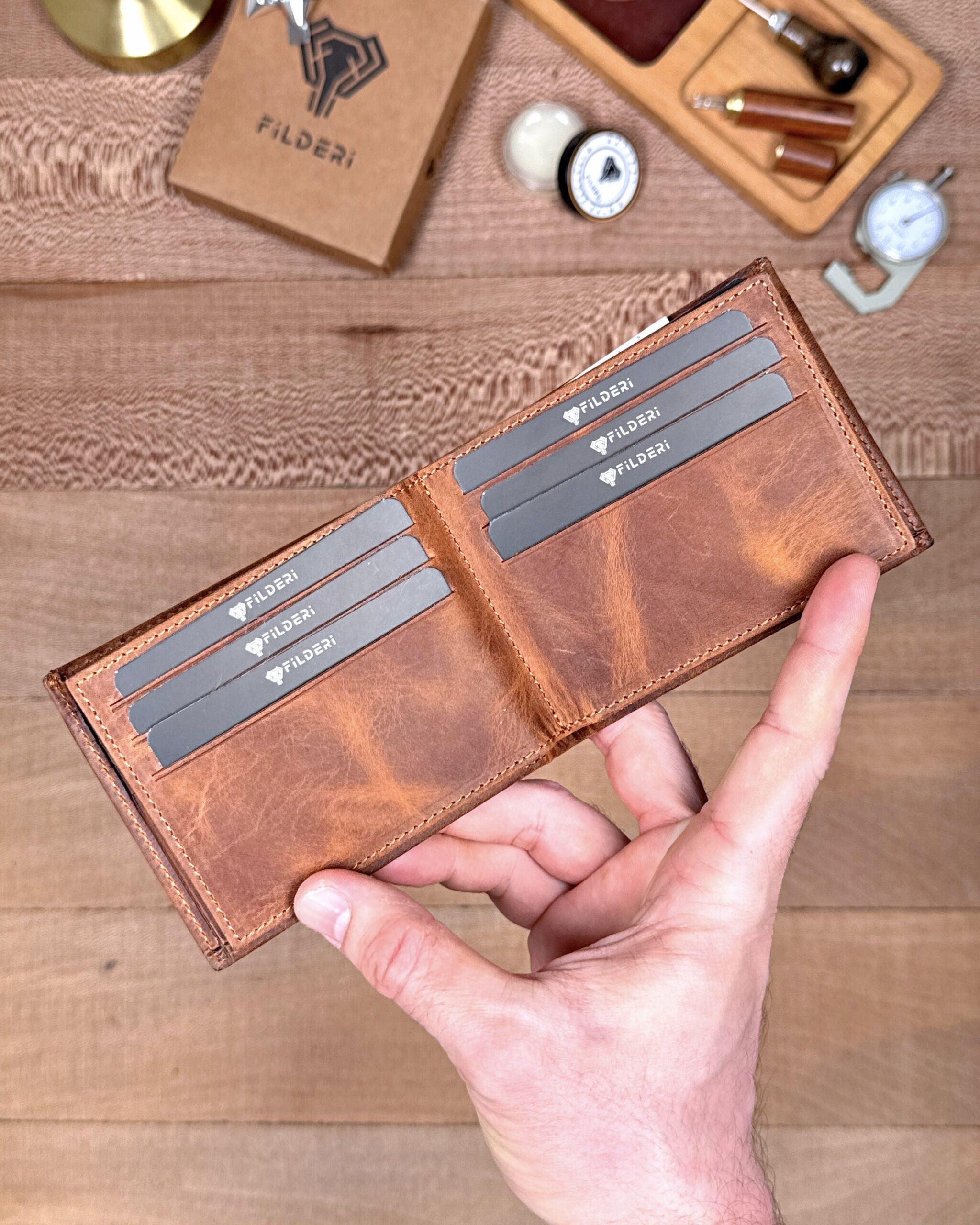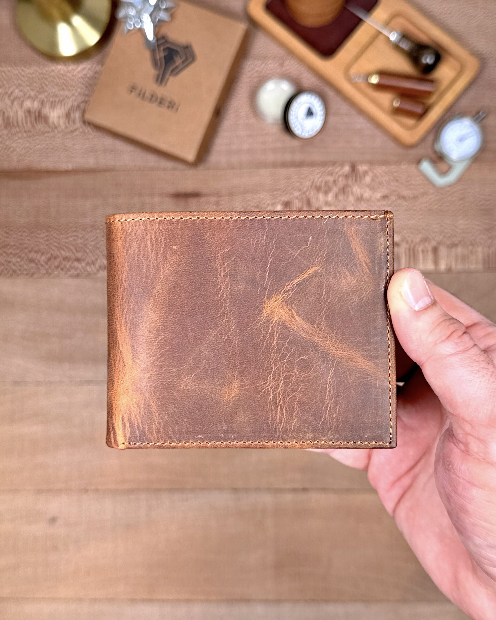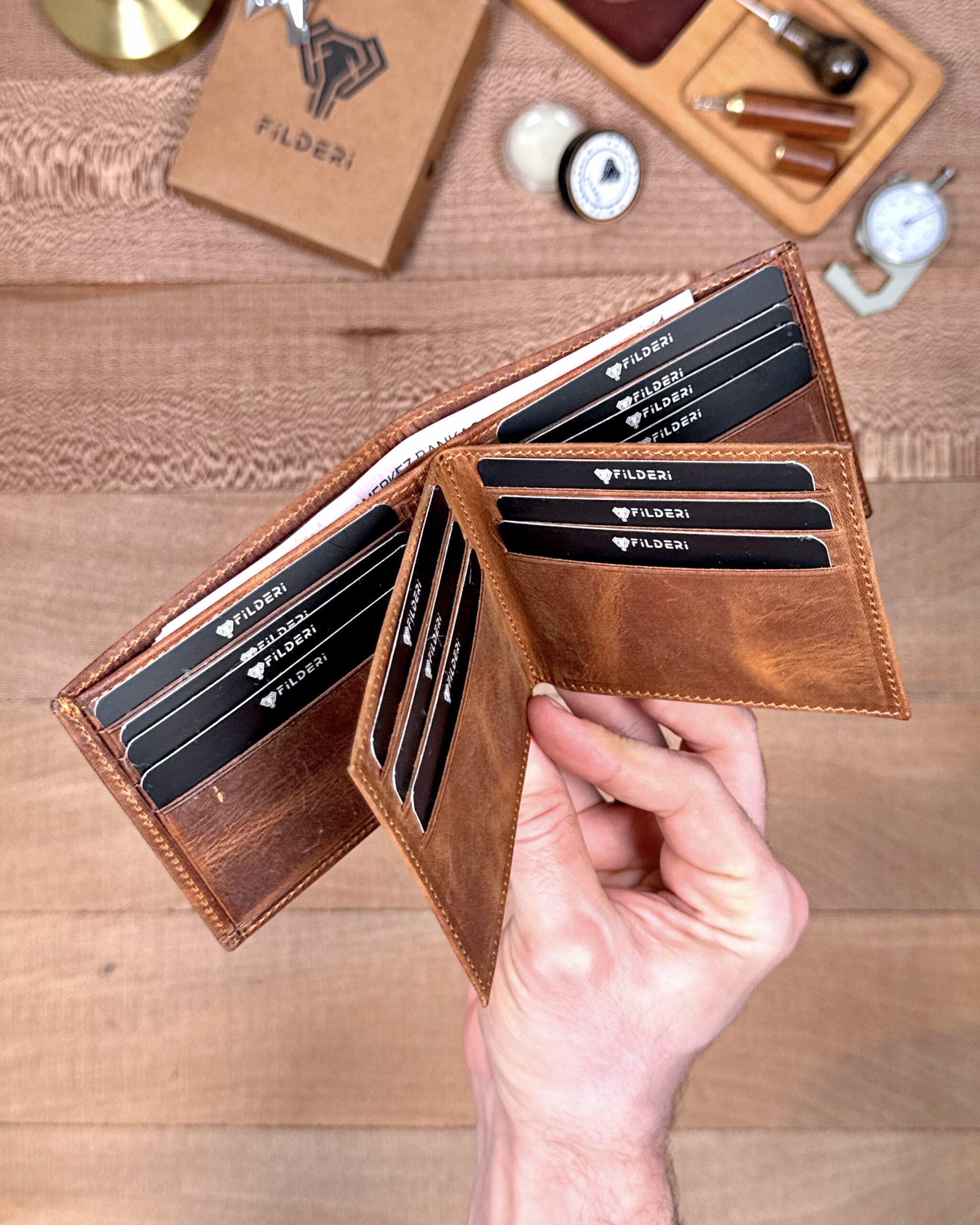 Derisi kaliteli, elde şık duruyor. Yeteri kadar kartlık gözü var, kağıt ve madeni paralar için kullanım kolay, telefon rahat sığıyor.