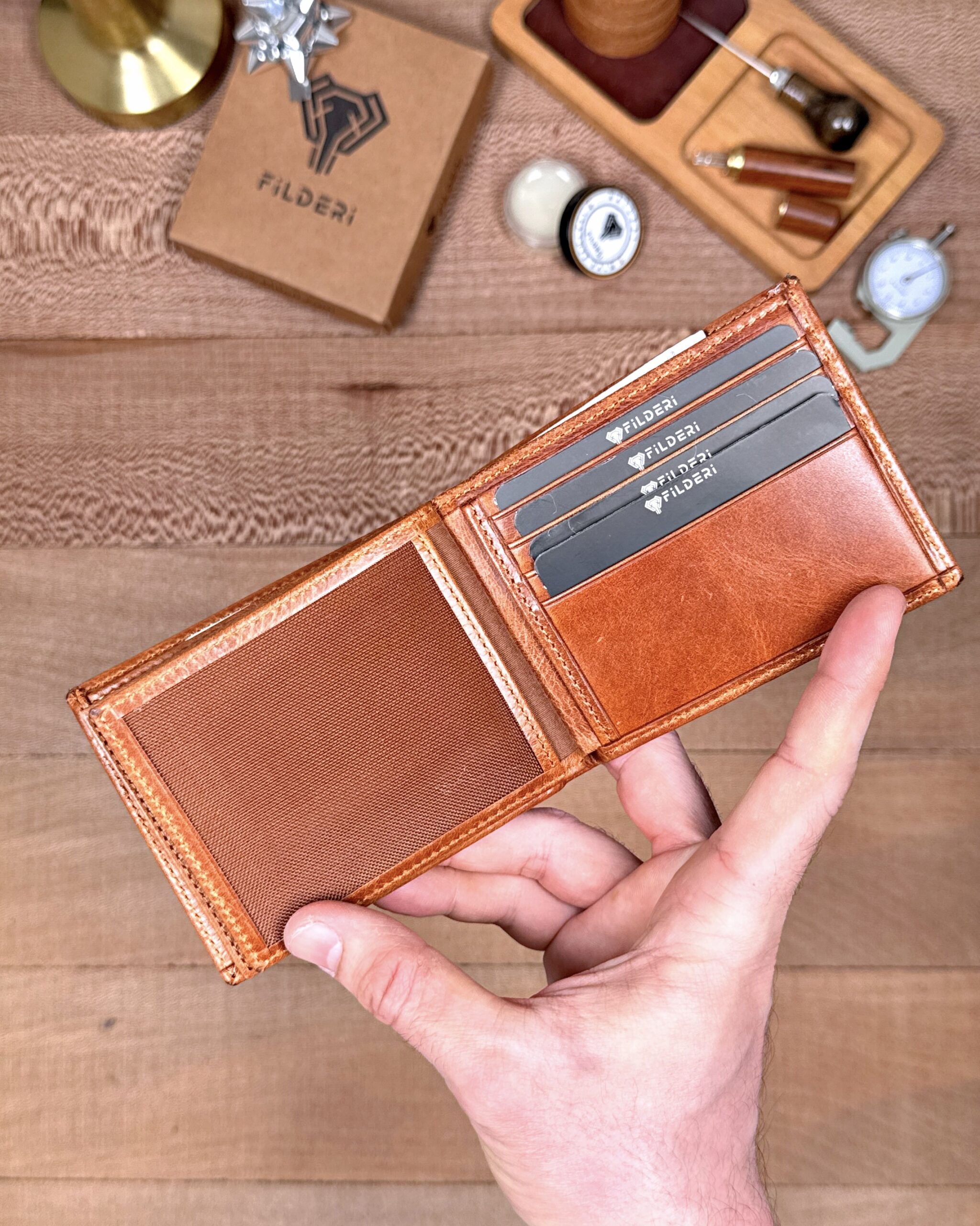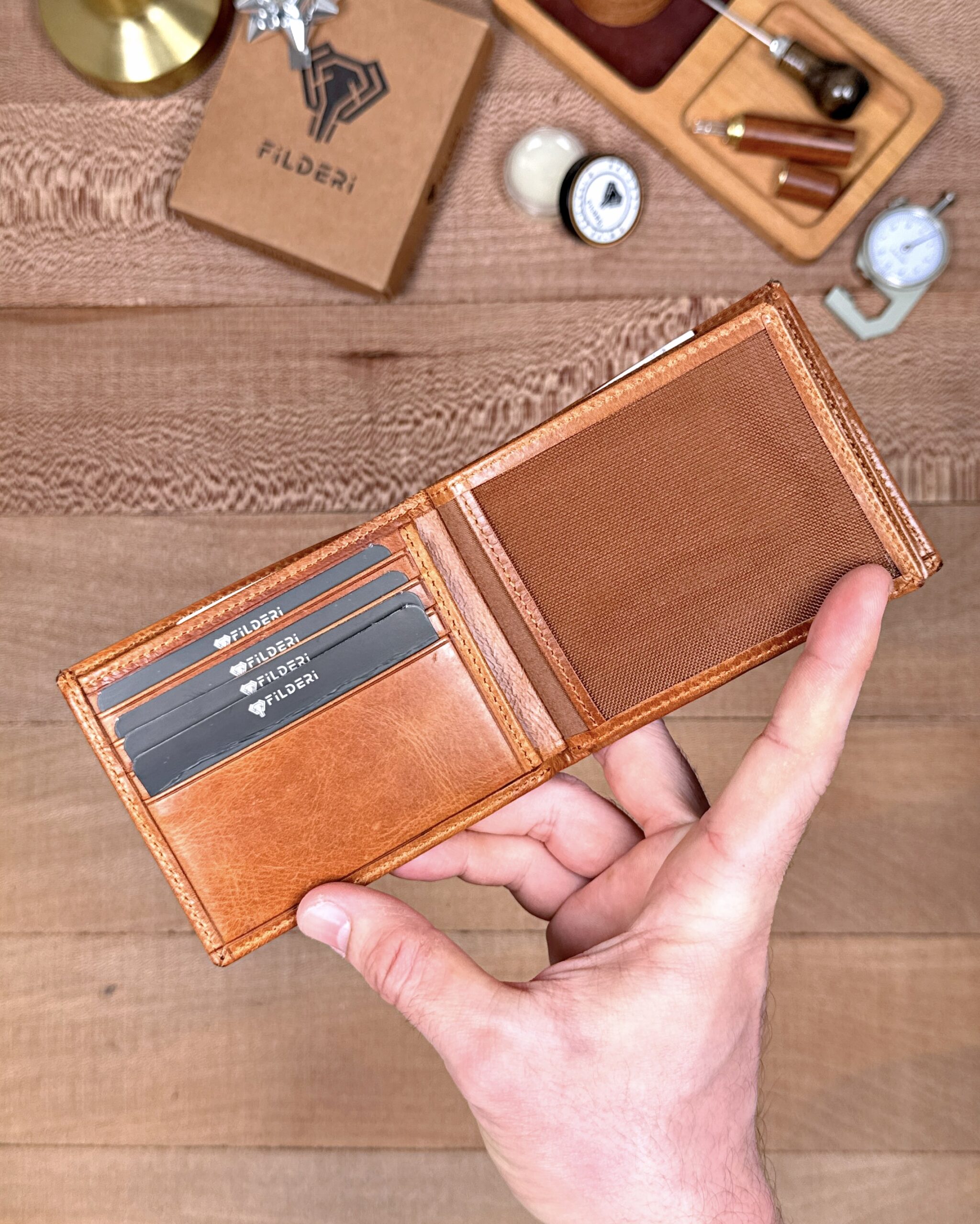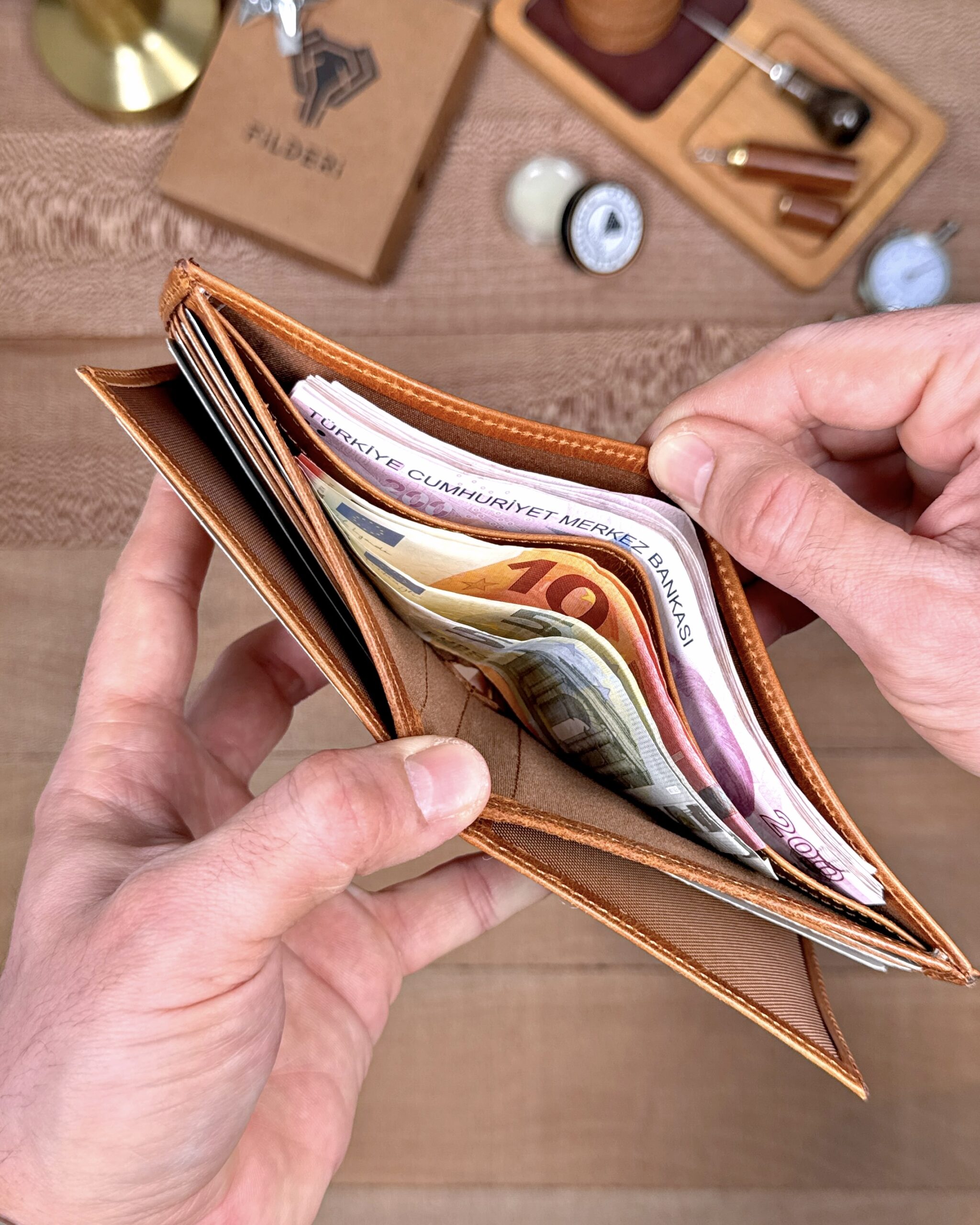 Derisi kaliteli, elde şık duruyor. Yeteri kadar kartlık gözü var, kağıt ve madeni paralar için kullanım kolay, telefon rahat sığıyor.