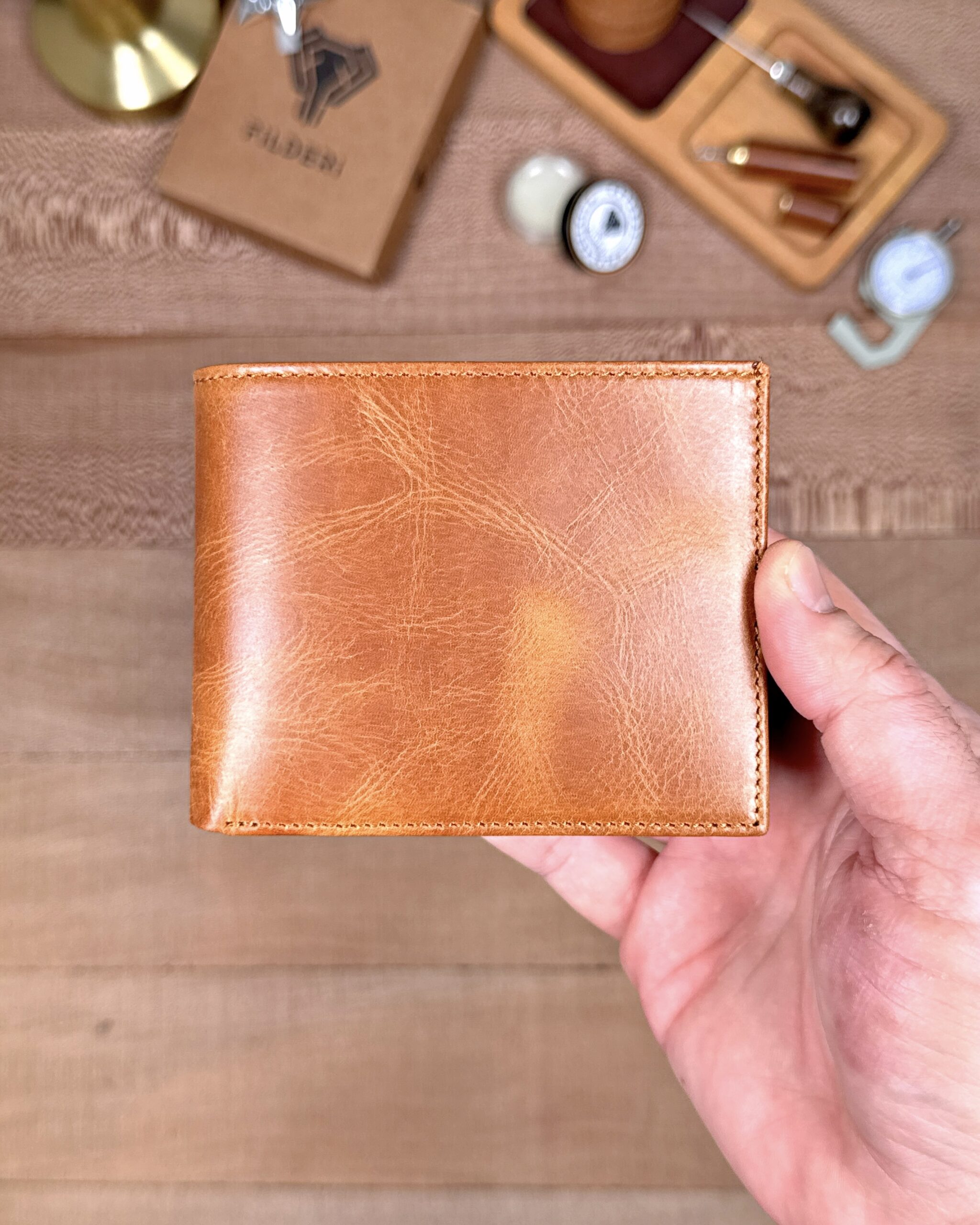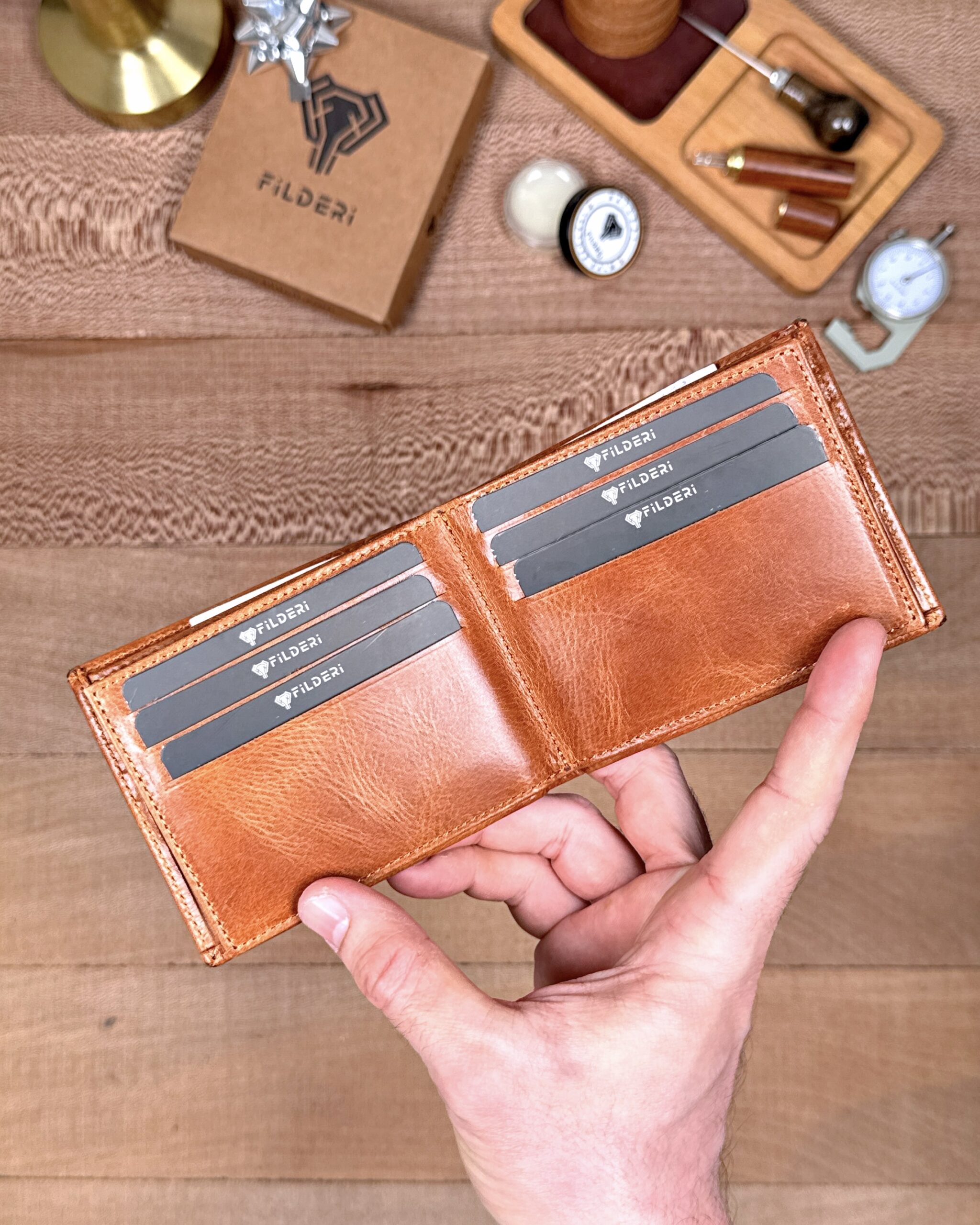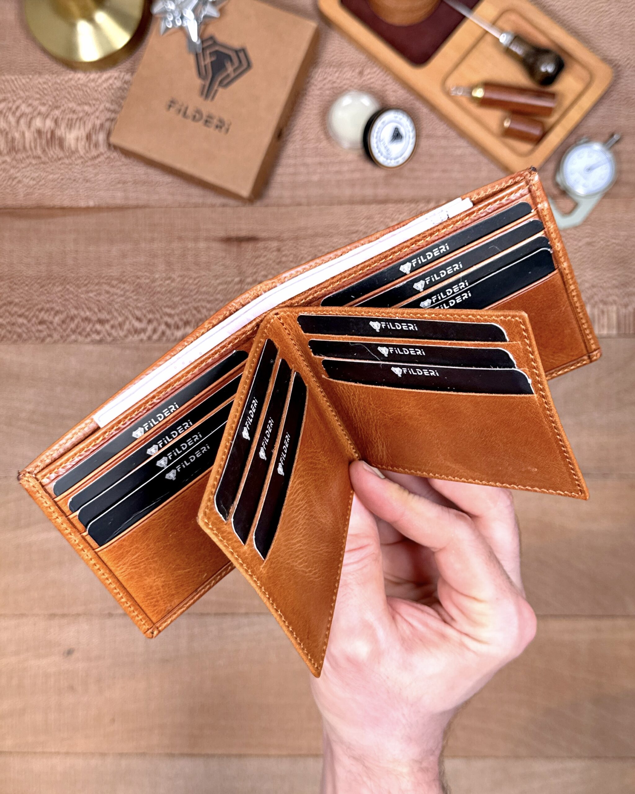 Derisi kaliteli, elde şık duruyor. Yeteri kadar kartlık gözü var, kağıt ve madeni paralar için kullanım kolay, telefon rahat sığıyor.