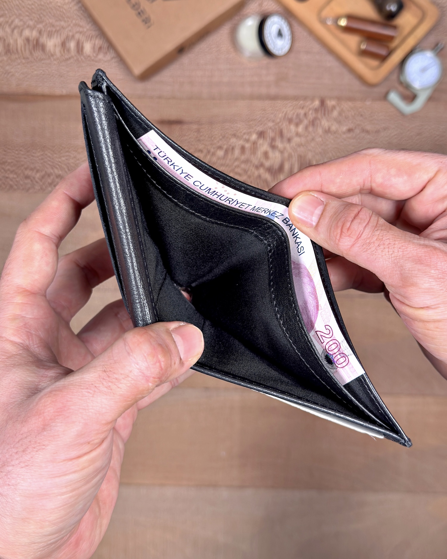 Derisi kaliteli, elde şık duruyor. Yeteri kadar kartlık gözü var, kağıt ve madeni paralar için kullanım kolay, telefon rahat sığıyor.