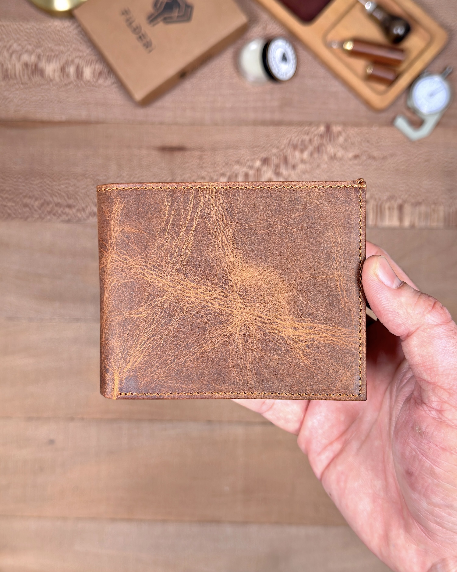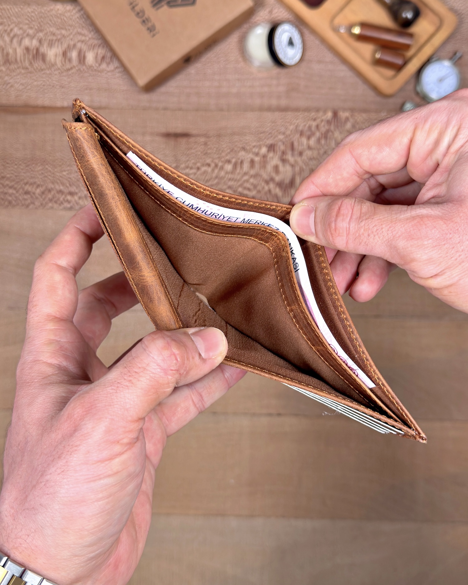 Derisi kaliteli, elde şık duruyor. Yeteri kadar kartlık gözü var, kağıt ve madeni paralar için kullanım kolay, telefon rahat sığıyor.