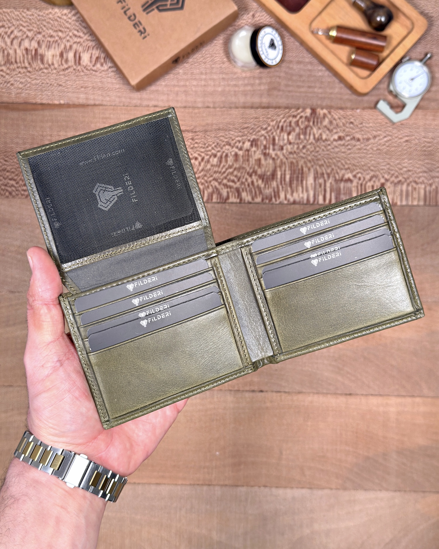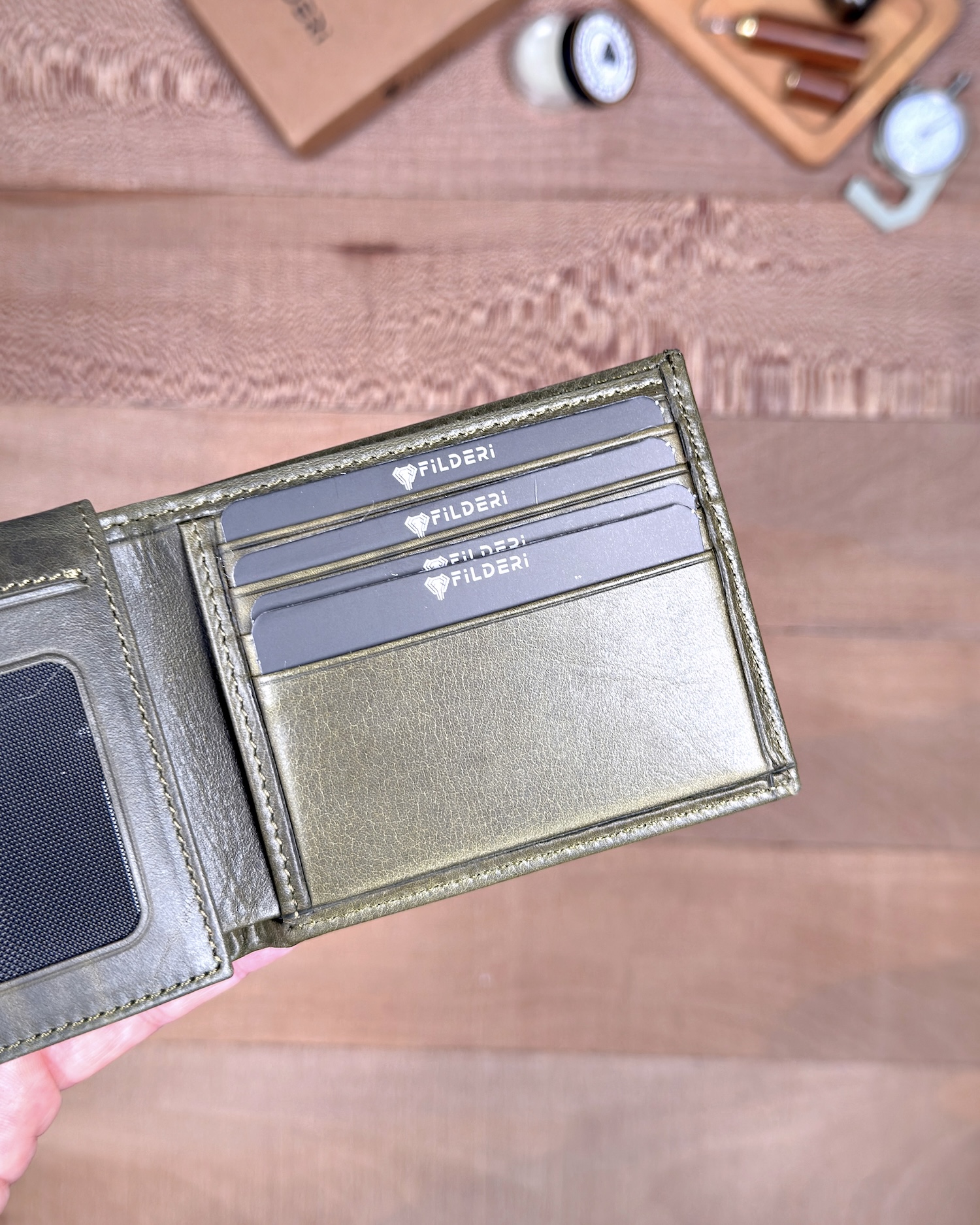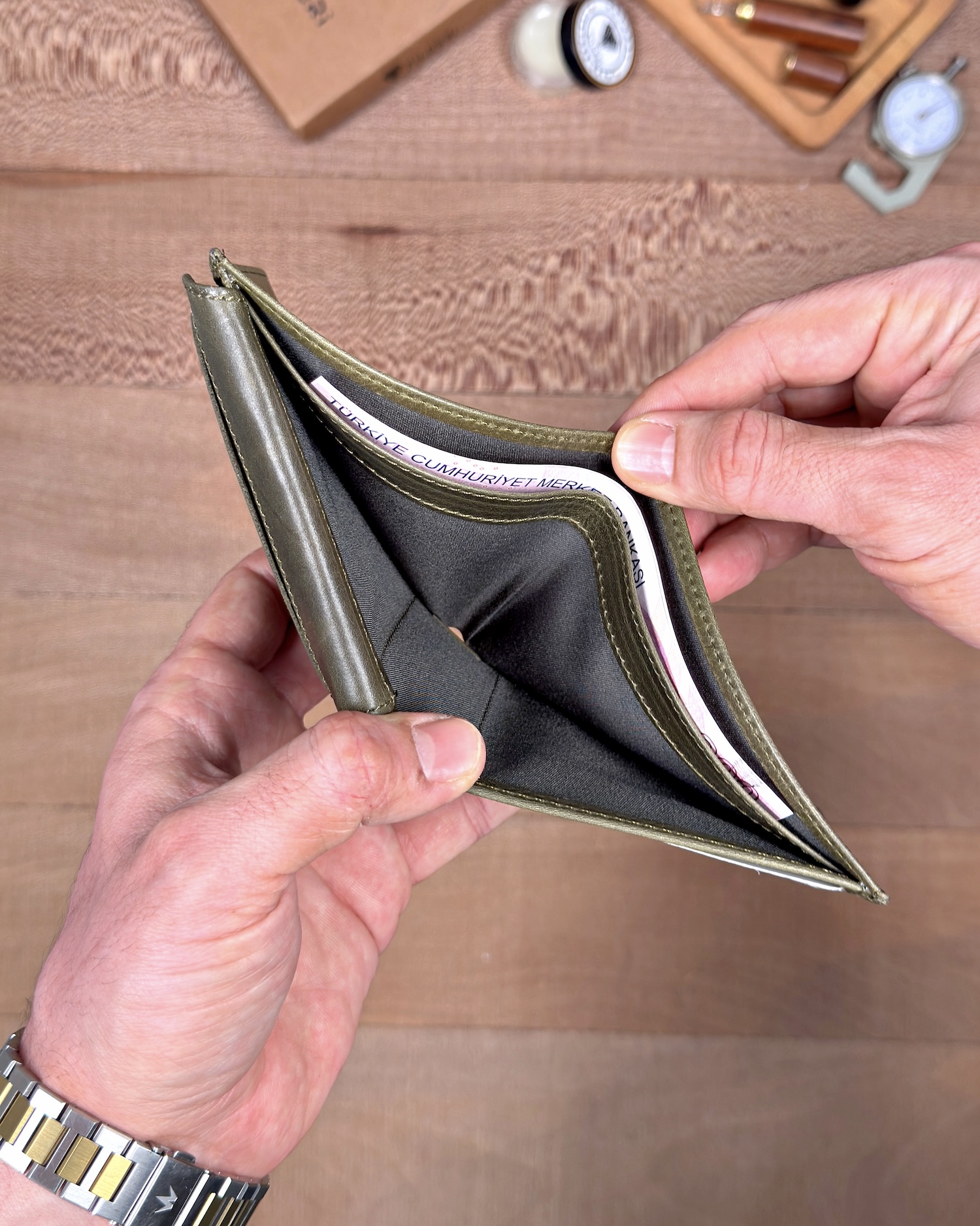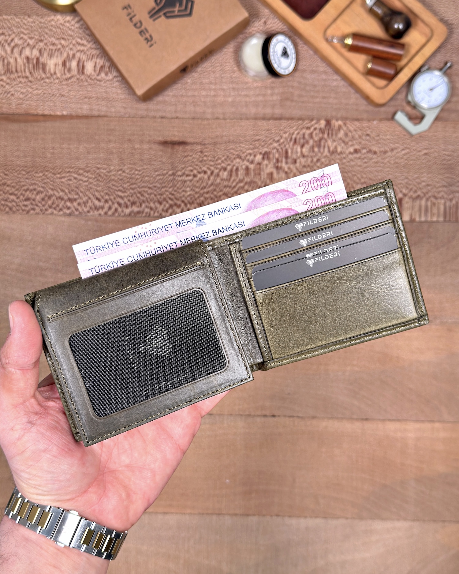 Derisi kaliteli, elde şık duruyor. Yeteri kadar kartlık gözü var, kağıt ve madeni paralar için kullanım kolay, telefon rahat sığıyor.