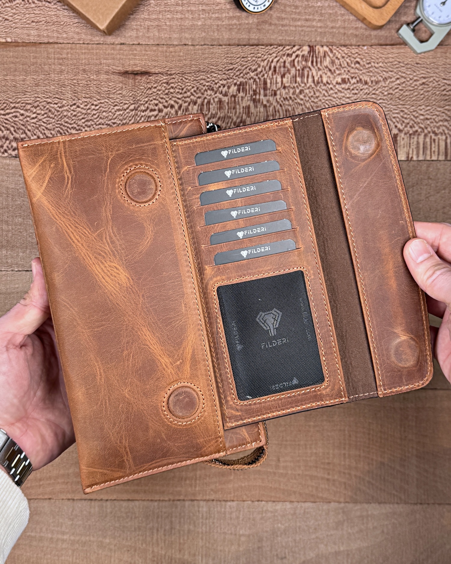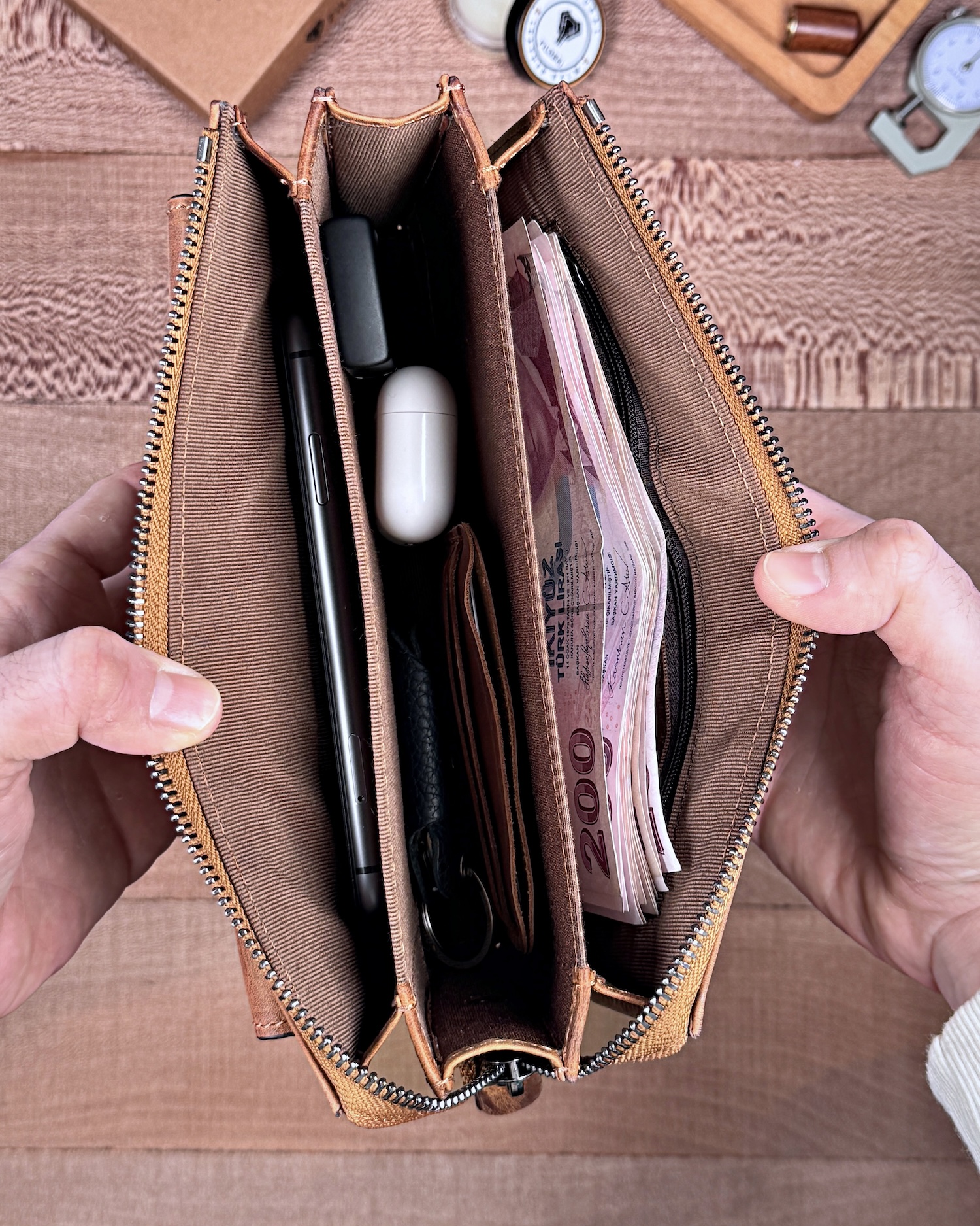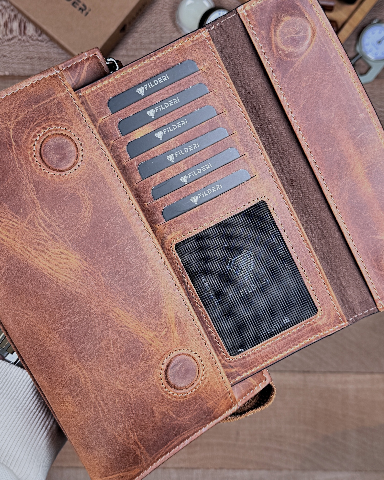 Derisi kaliteli, elde şık duruyor. Yeteri kadar kartlık gözü var, kağıt ve madeni paralar için kullanım kolay, telefon rahat sığıyor.