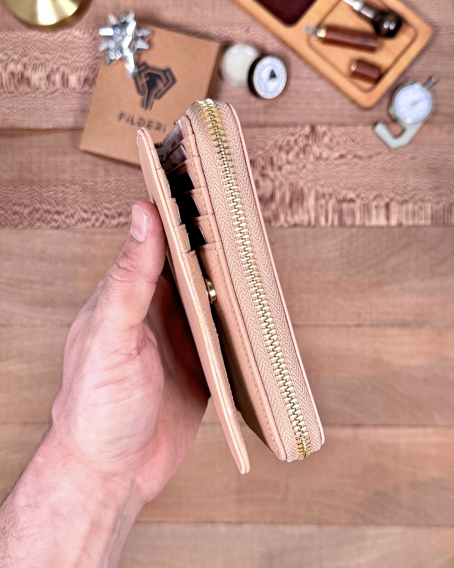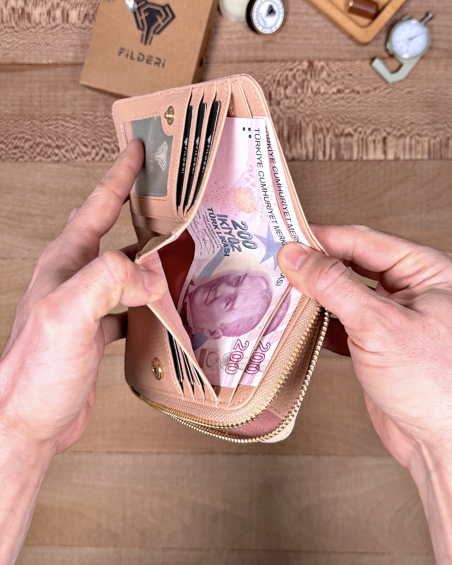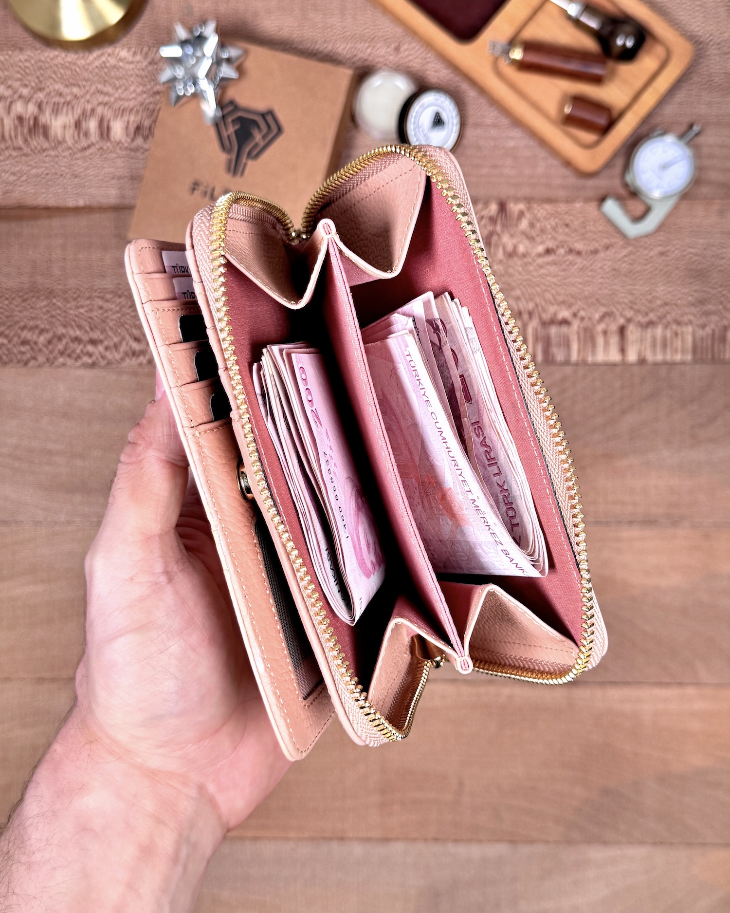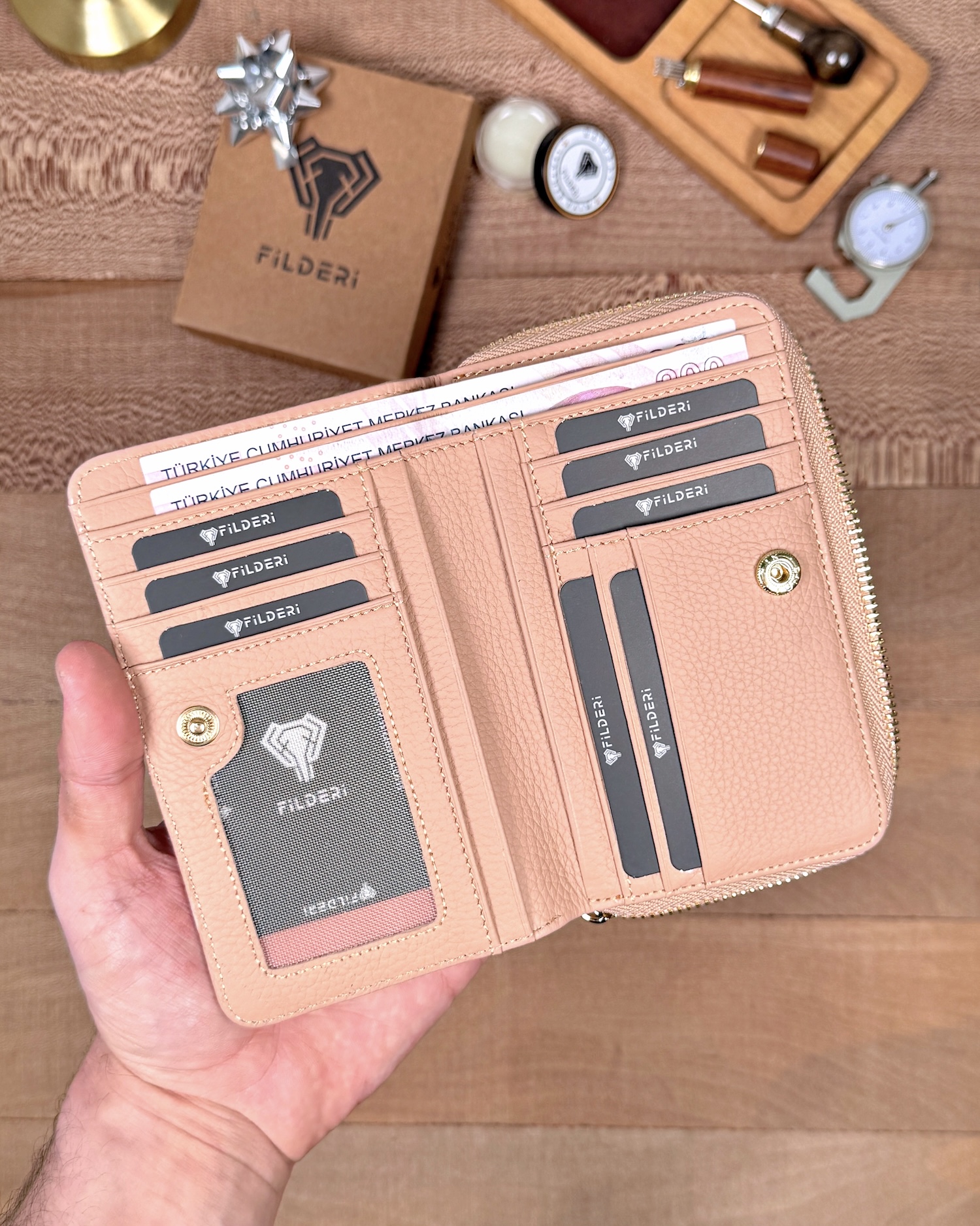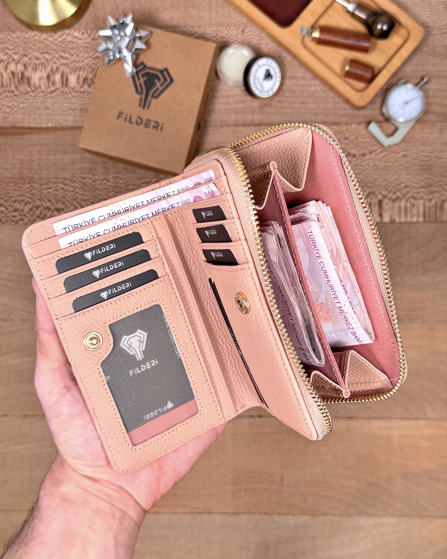 Kadın Pudra cüzdan tercih edenlere hitap eder; doğum günü, anneler günü ya da yılbaşı gibi anlamlı günlerde tercih edilebilir. Fil deri kadın cüzdan koleksiyonlarının en seçkin parçalarından biridir.