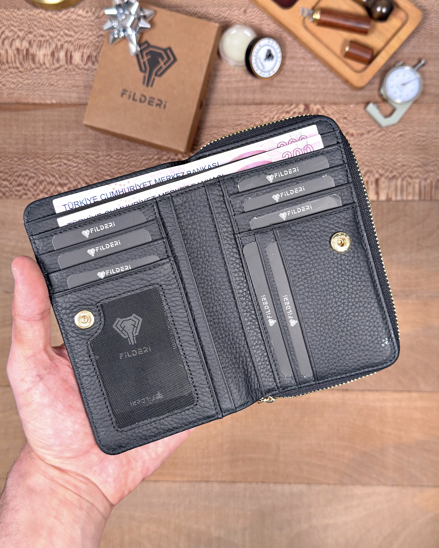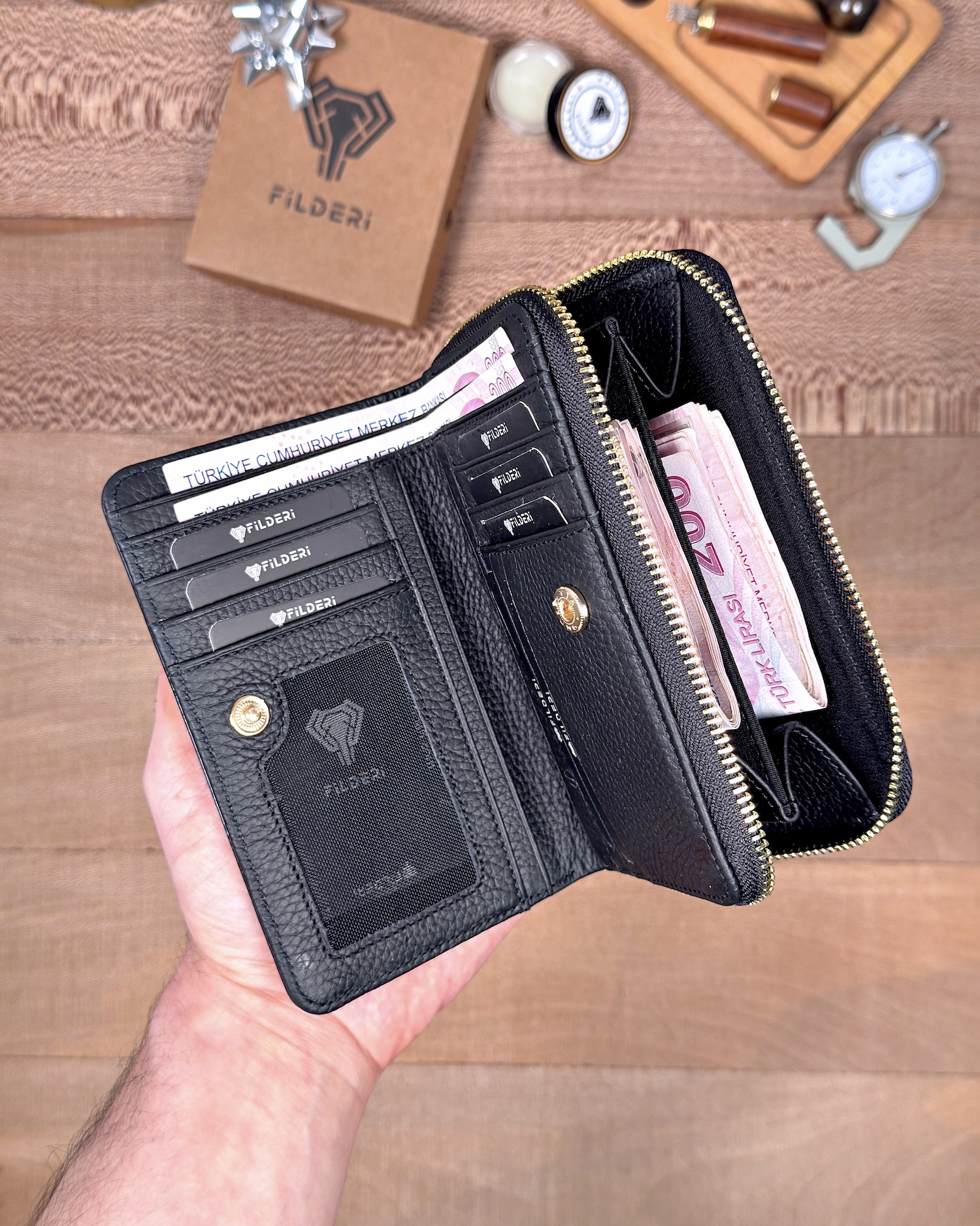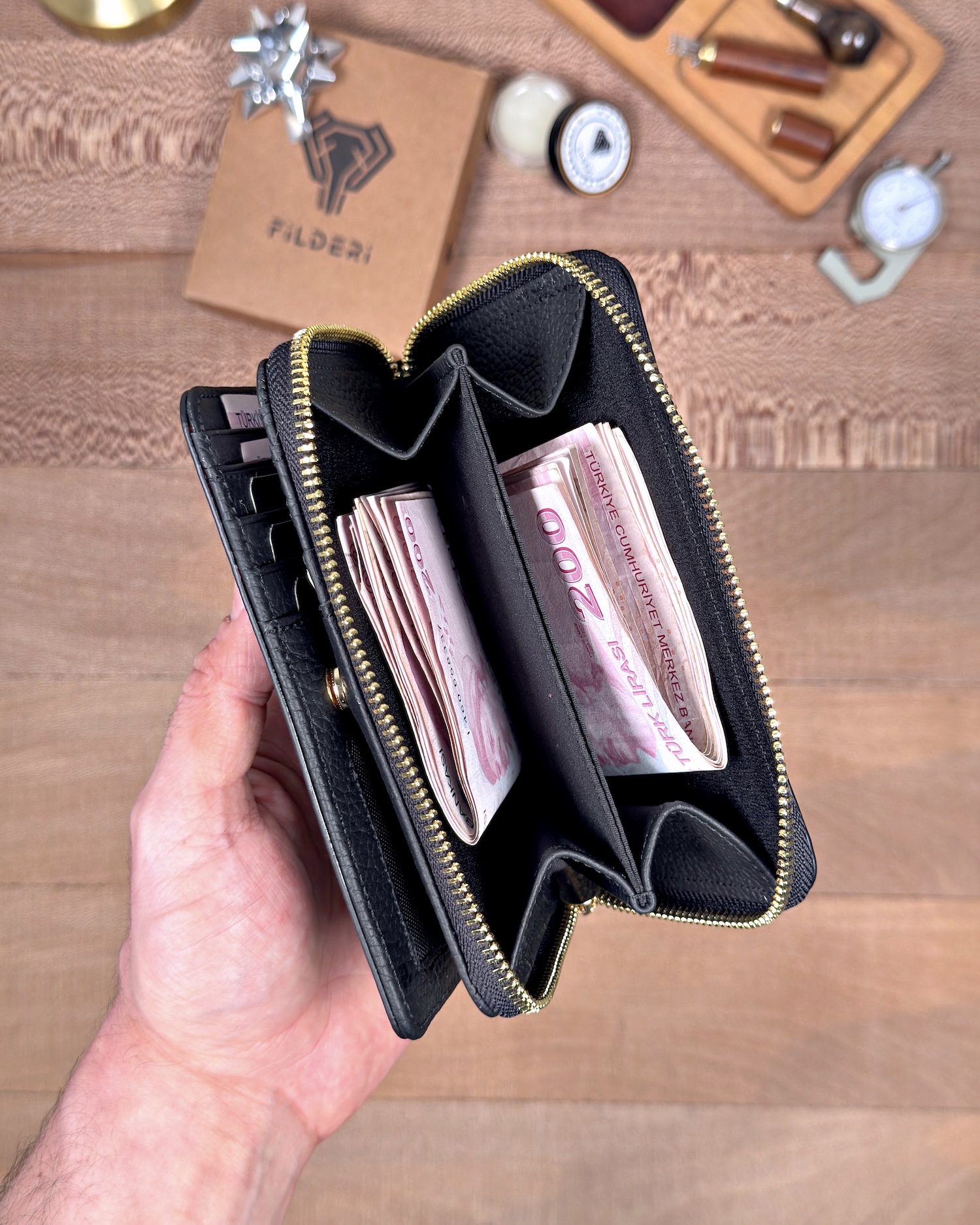 Kadın Siyah cüzdan tercih edenlere hitap eder; doğum günü, anneler günü ya da yılbaşı gibi anlamlı günlerde tercih edilebilir. Fil deri kadın cüzdan koleksiyonlarının en seçkin parçalarından biridir.