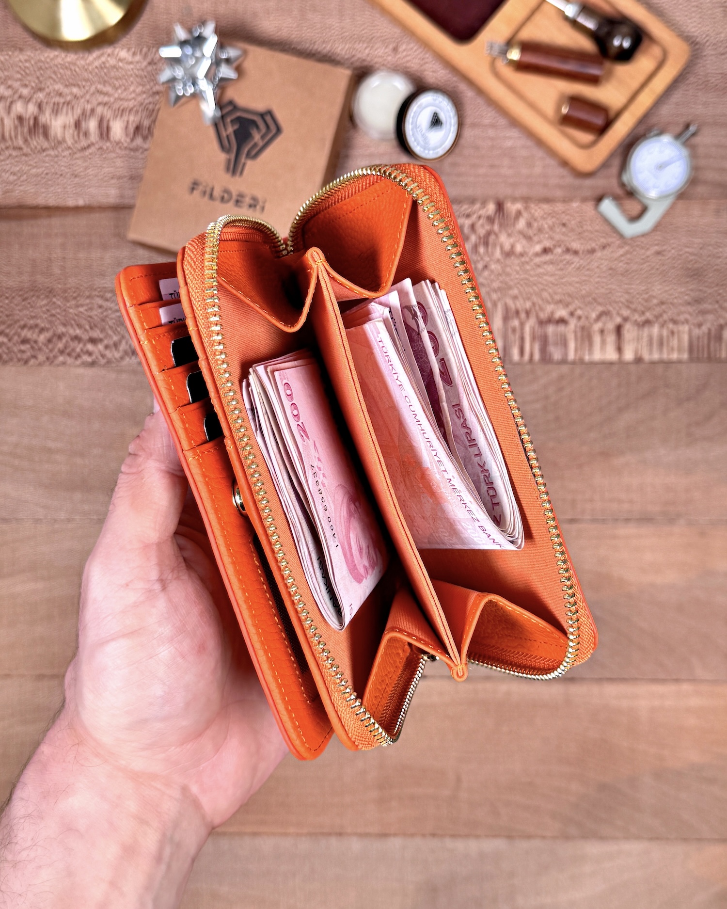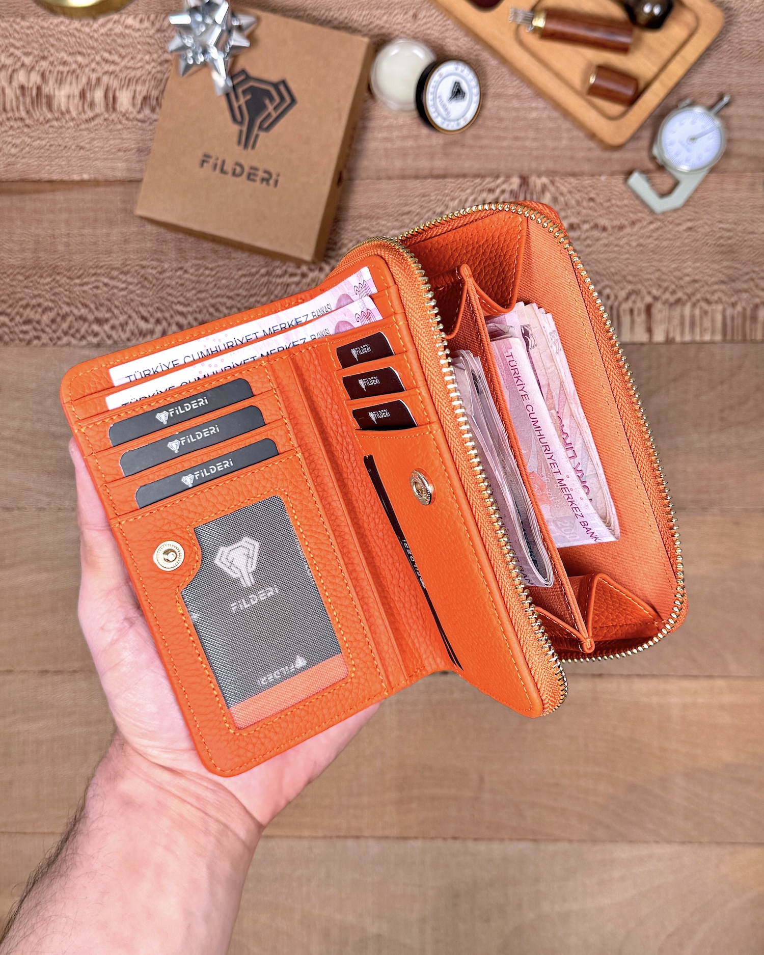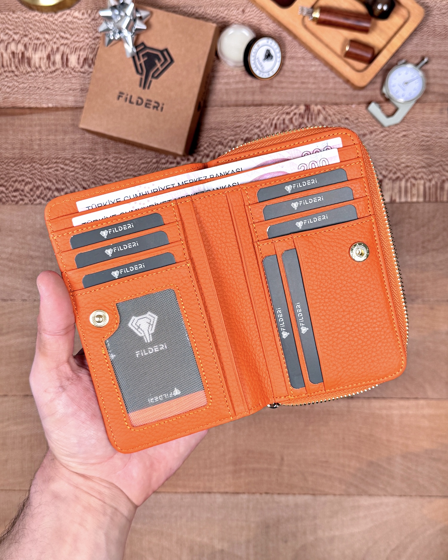 Kadın Turuncu cüzdan tercih edenlere hitap eder; doğum günü, anneler günü ya da yılbaşı gibi anlamlı günlerde tercih edilebilir. Fil deri kadın cüzdan koleksiyonlarının en seçkin parçalarından biridir.