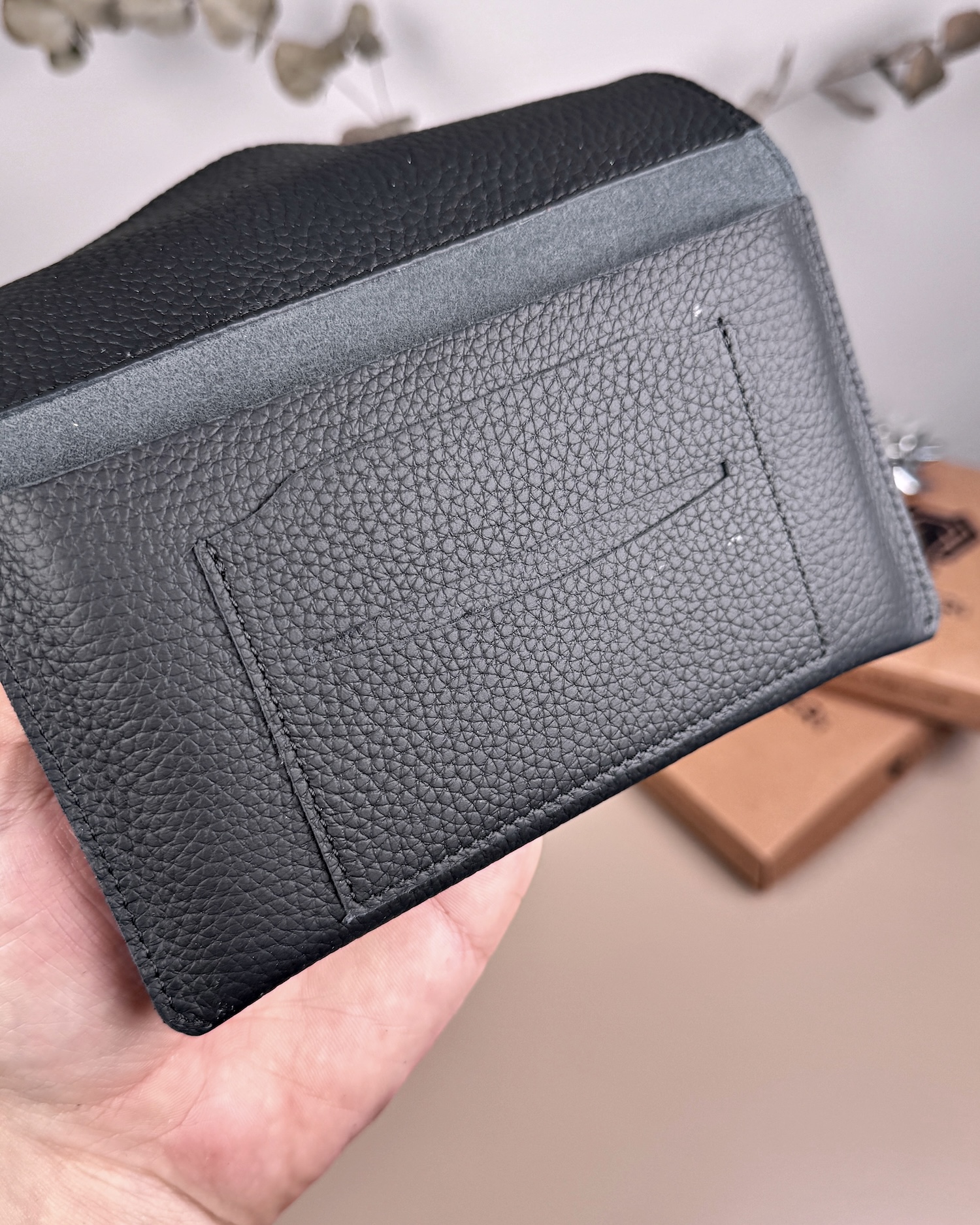 Derisi kaliteli, elde şık duruyor. Yeteri kadar kartlık gözü var, kağıt ve madeni paralar için kullanım kolay, telefon rahat sığıyor.
