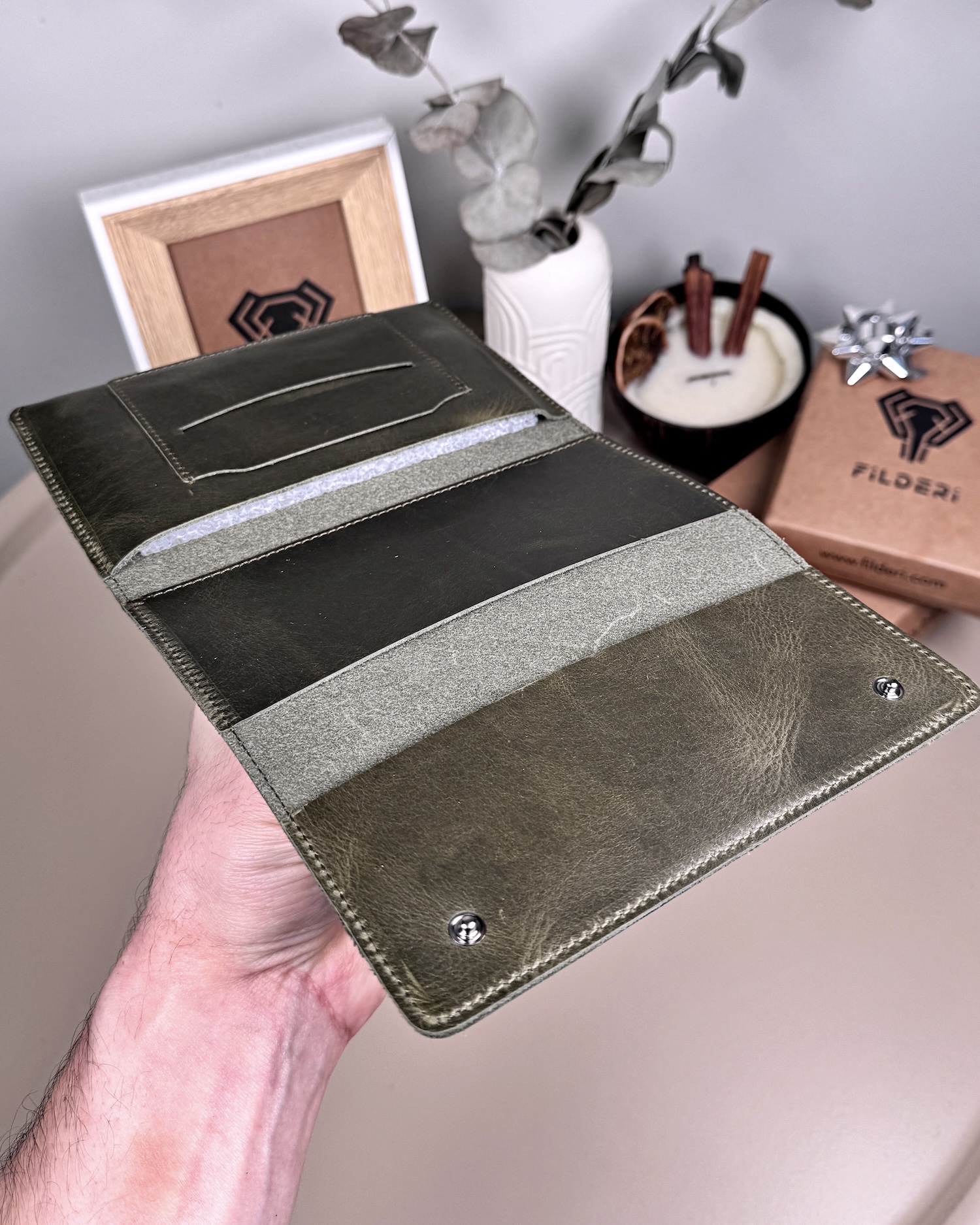 Derisi kaliteli, elde şık duruyor. Yeteri kadar kartlık gözü var, kağıt ve madeni paralar için kullanım kolay, telefon rahat sığıyor.