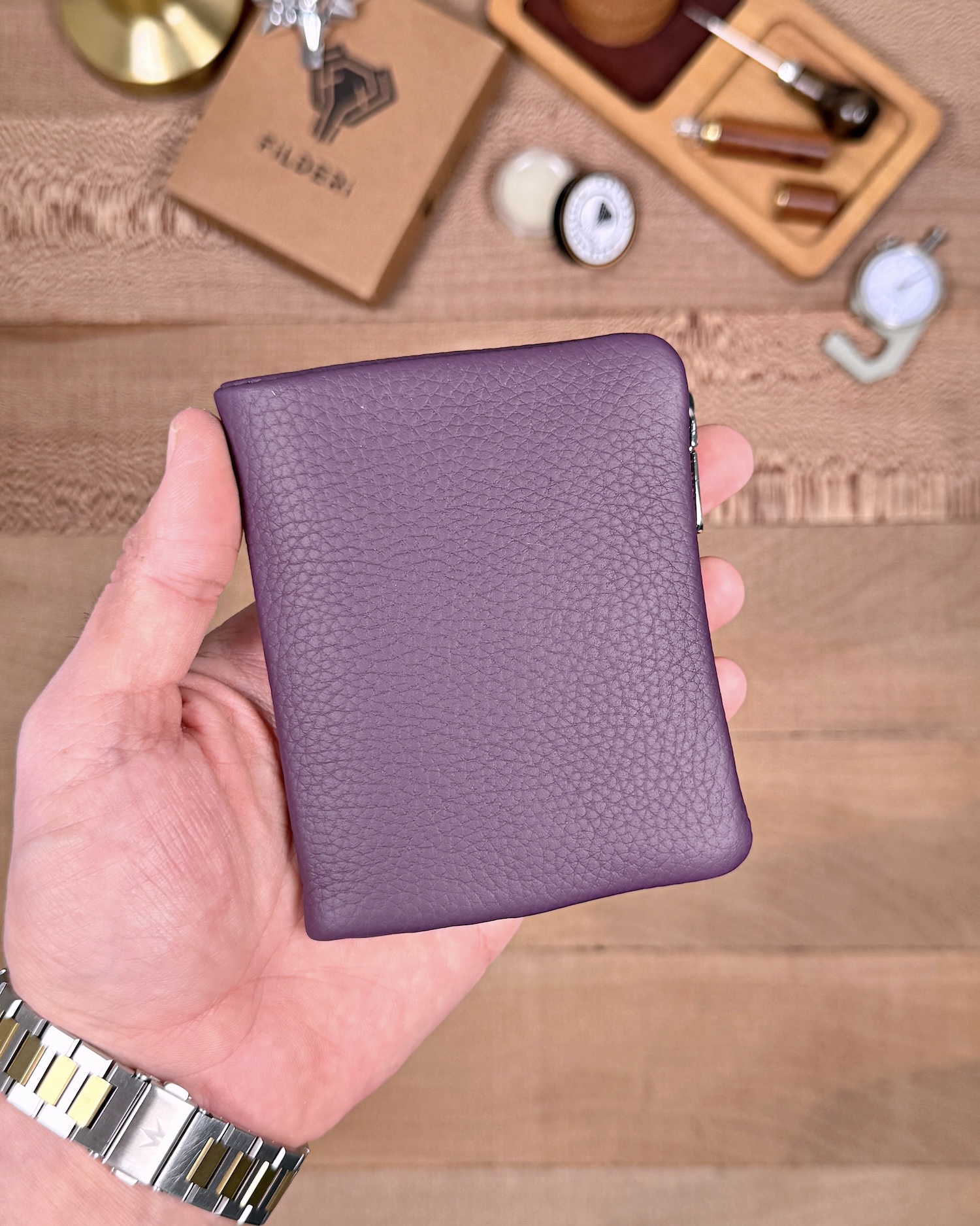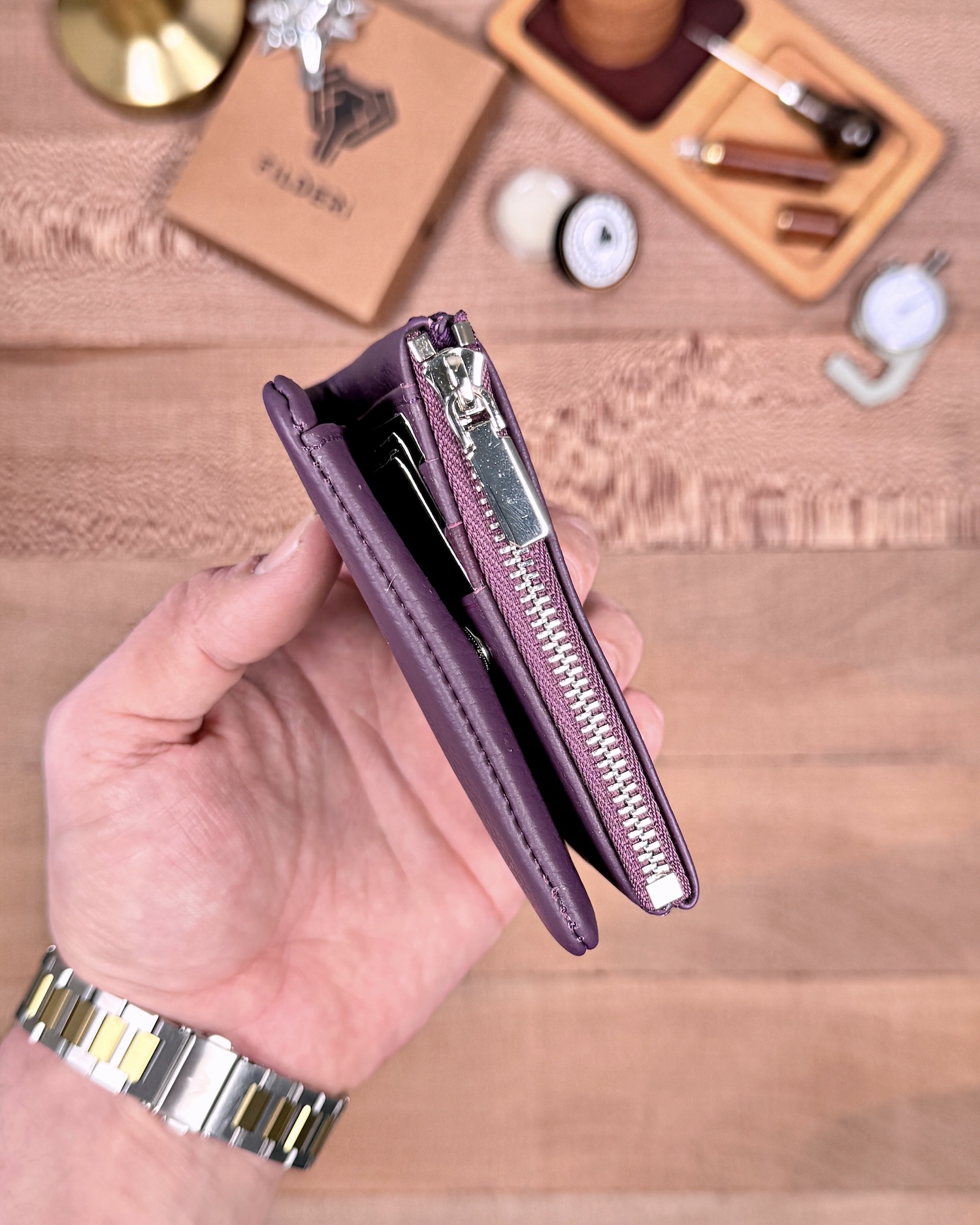 Derisi kaliteli, elde şık duruyor. Yeteri kadar kartlık gözü var, kağıt ve madeni paralar için kullanım kolay, telefon rahat sığıyor.