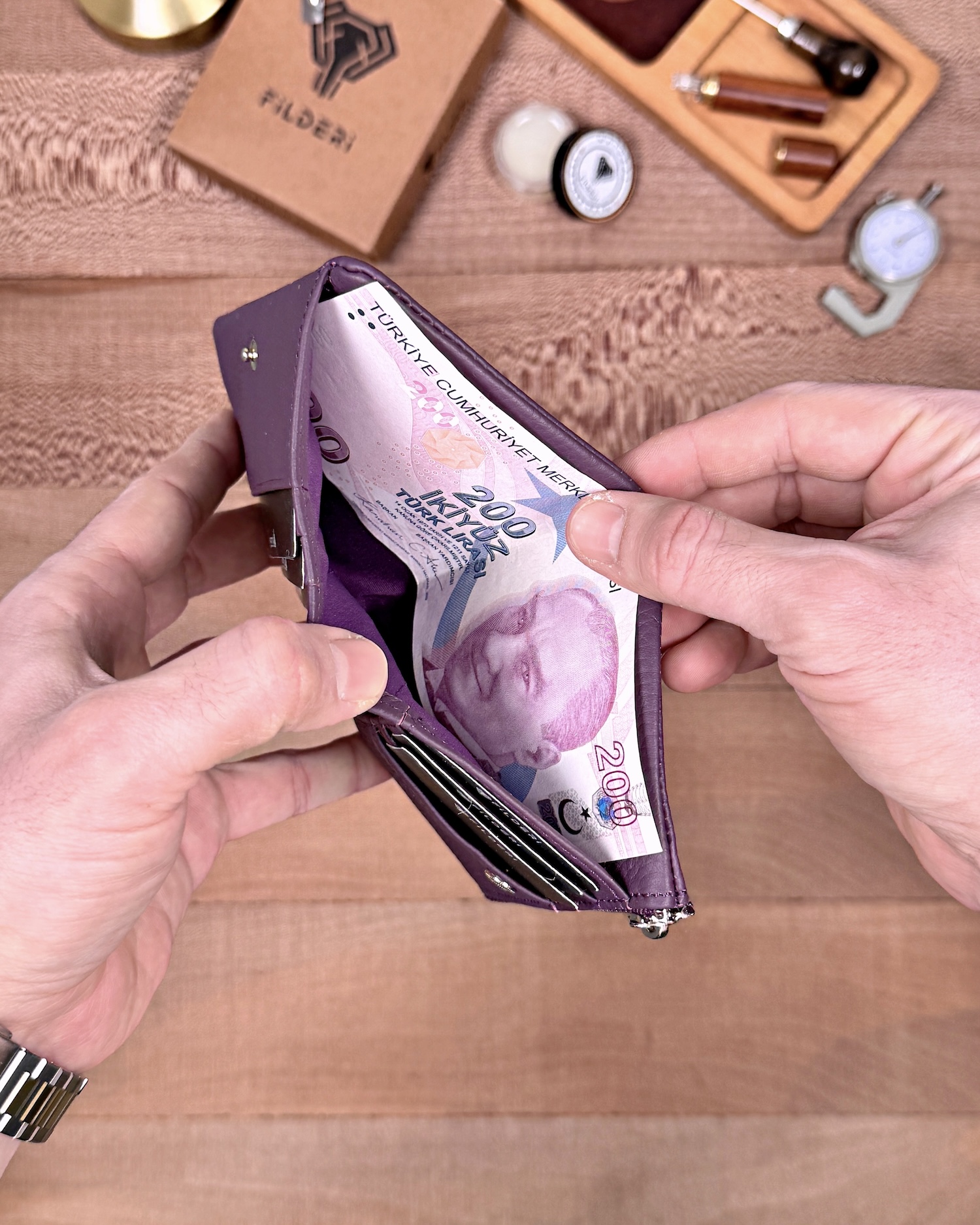 Sipariş vermeden önce önyargılarım vardı .sosyalmeydayadn bubtur seylere pek guvenmemekle birlikte arasirmalar yaptım. Çok güzel yorumlar gördüm. Almaya karar verdim . Ne kadar iyi bişey yaptığımı ürün iki gün sonra elime ulaşıp paketi açıp o deri cüzdanı elime alınca kalitesi kokusu. Kusursuzluğu beni çok etkiledi görselde gorunenenin aynısı fil deriye teşekkürler.