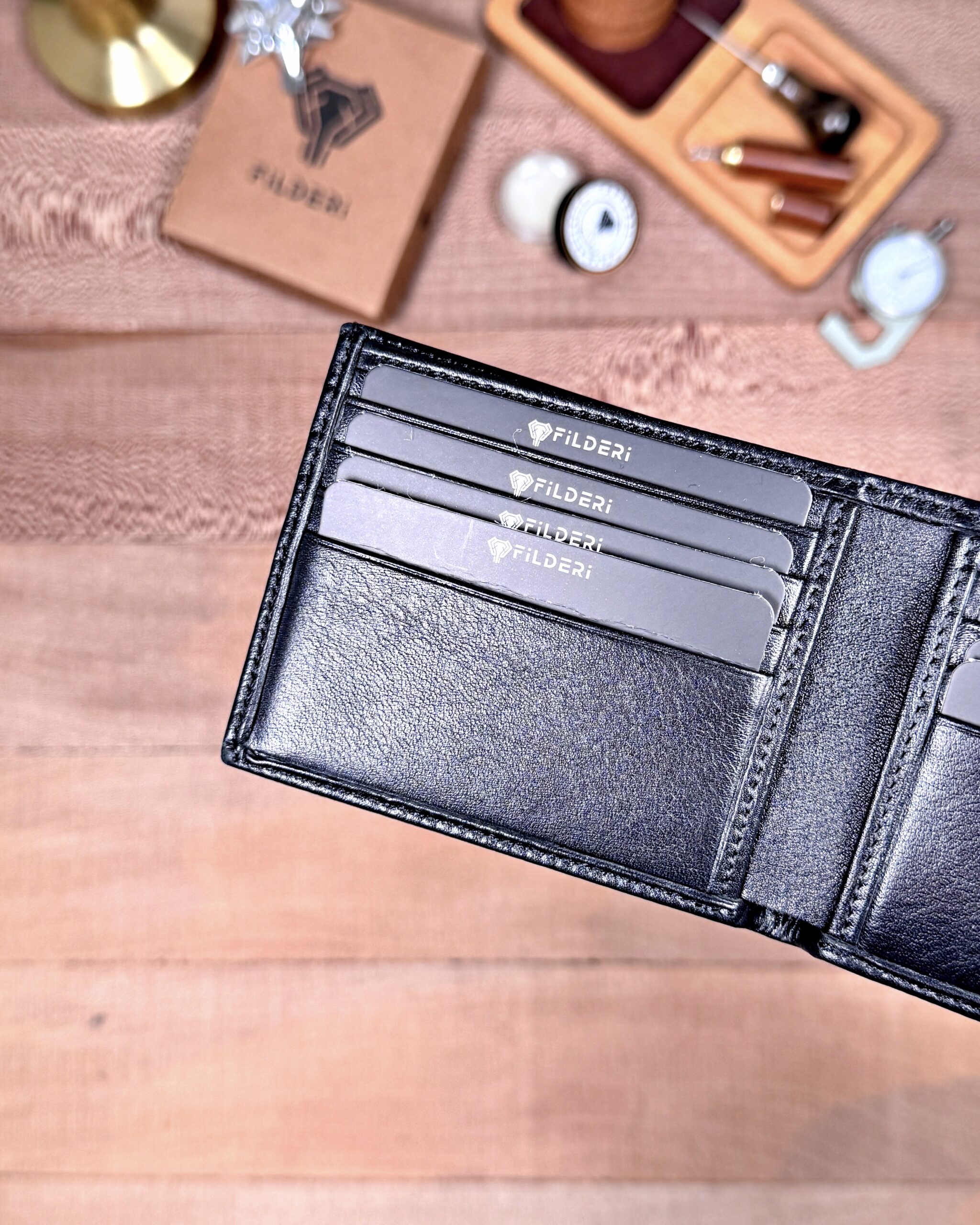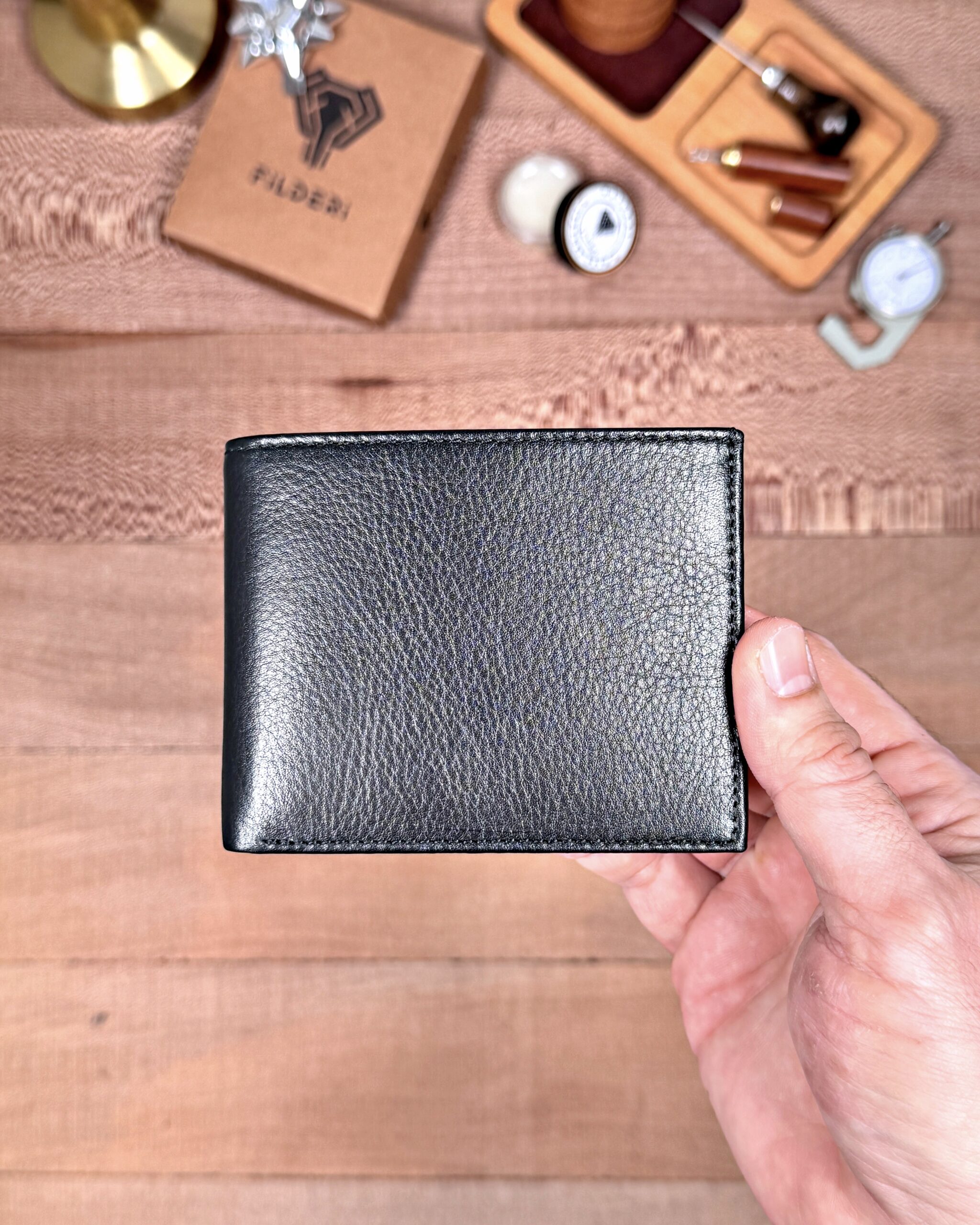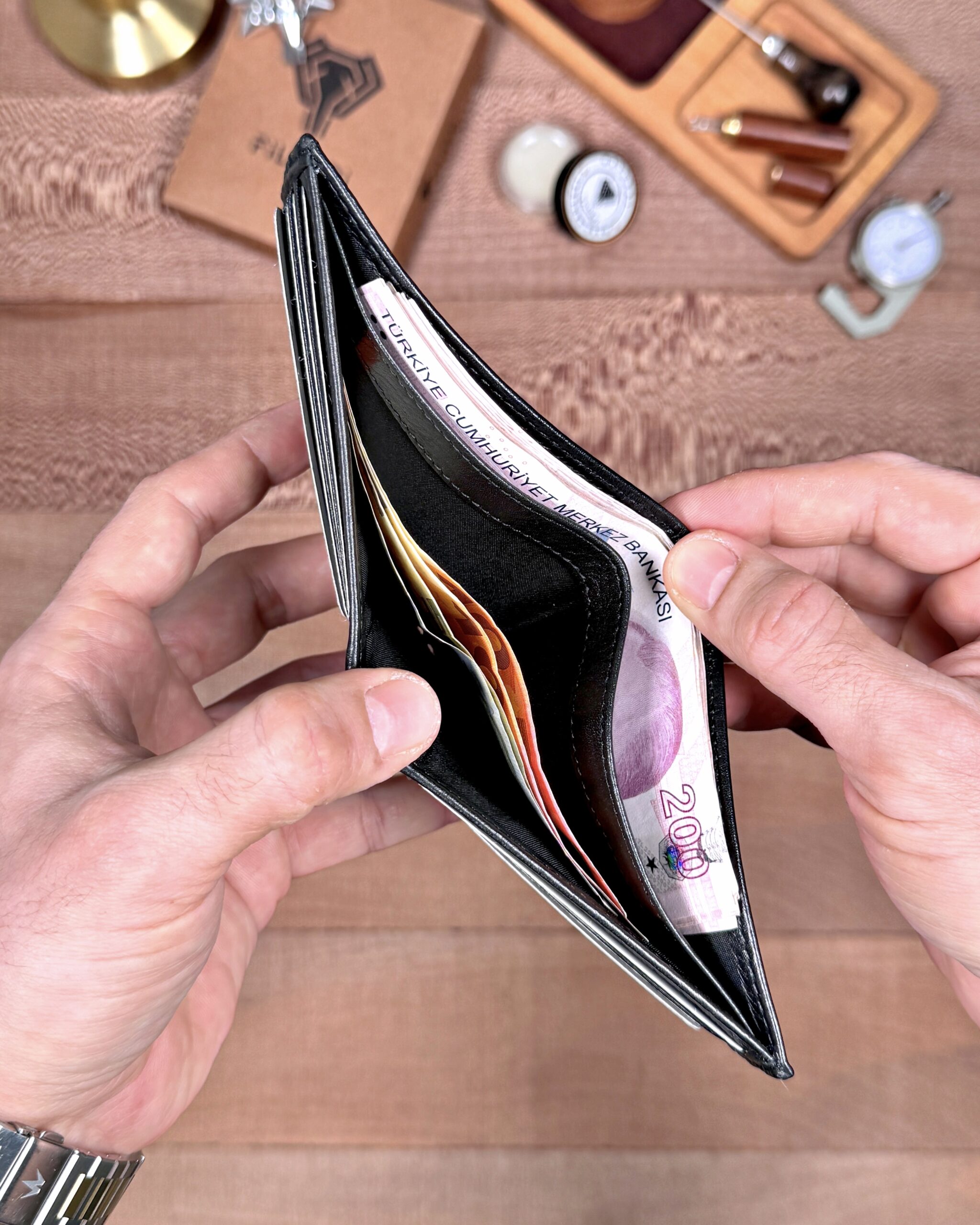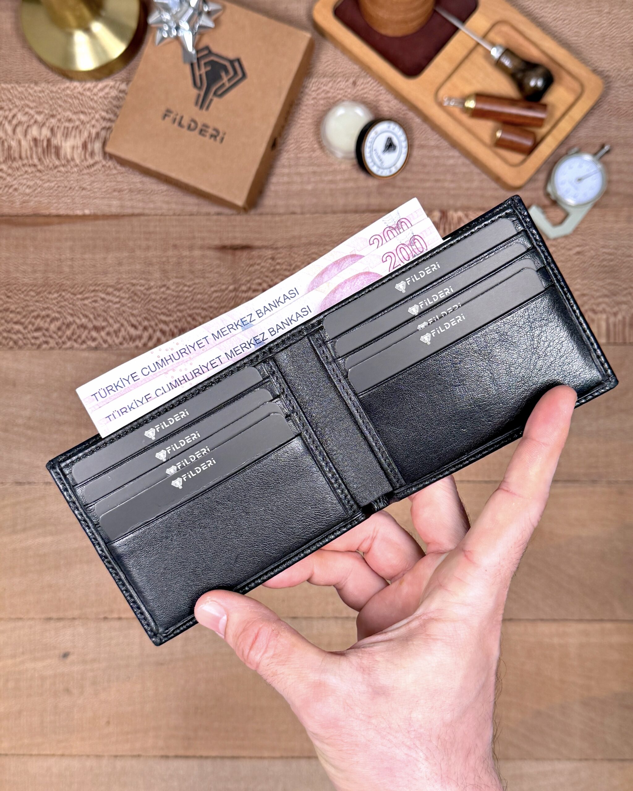 Derisi kaliteli, elde şık duruyor. Yeteri kadar kartlık gözü var, kağıt ve madeni paralar için kullanım kolay, telefon rahat sığıyor.