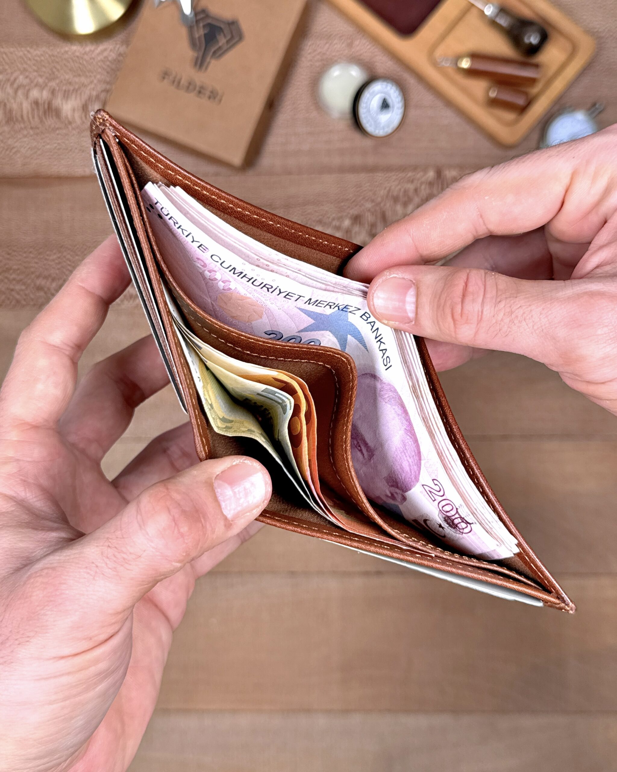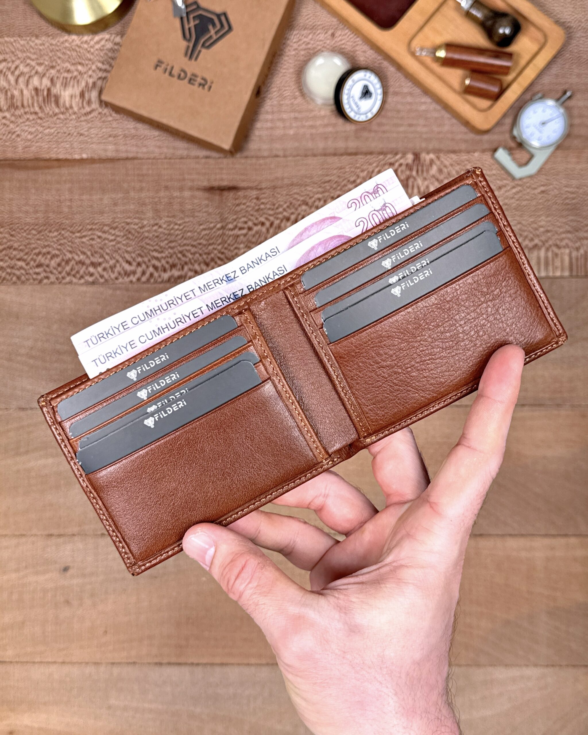 Derisi kaliteli, elde şık duruyor. Yeteri kadar kartlık gözü var, kağıt ve madeni paralar için kullanım kolay, telefon rahat sığıyor.