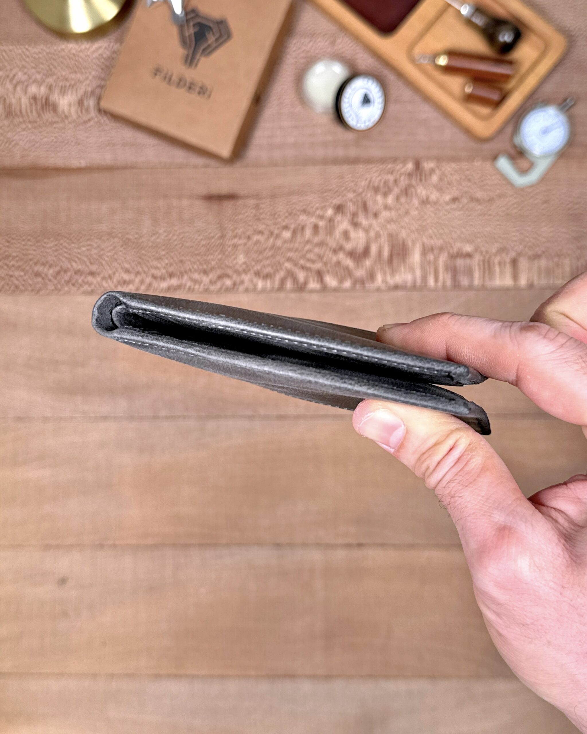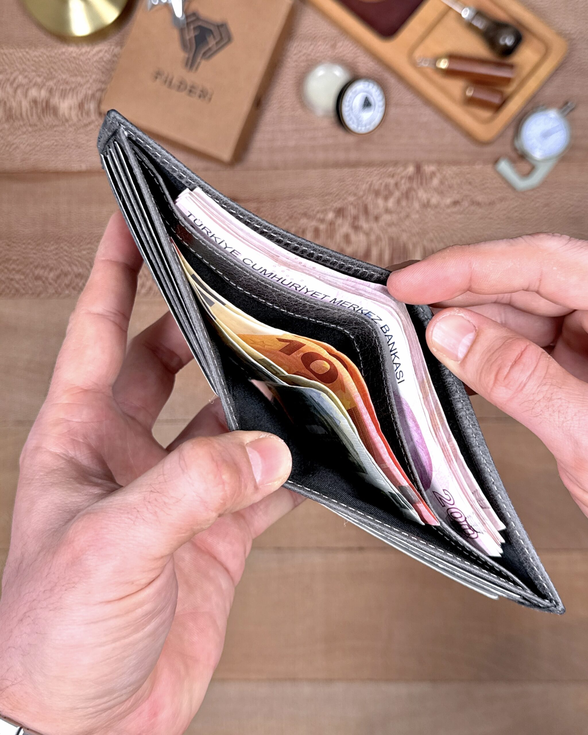 Derisi kaliteli, elde şık duruyor. Yeteri kadar kartlık gözü var, kağıt ve madeni paralar için kullanım kolay, telefon rahat sığıyor.