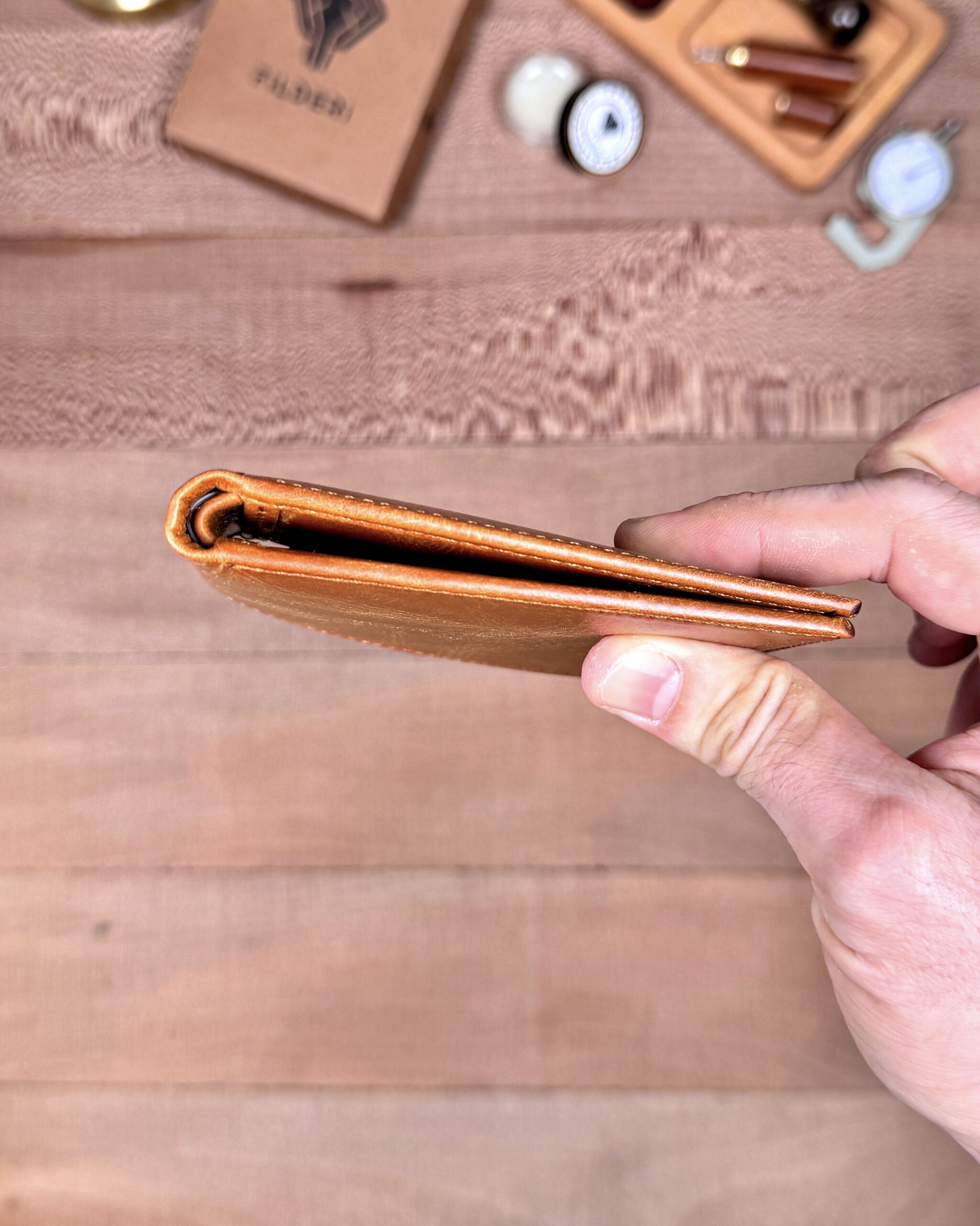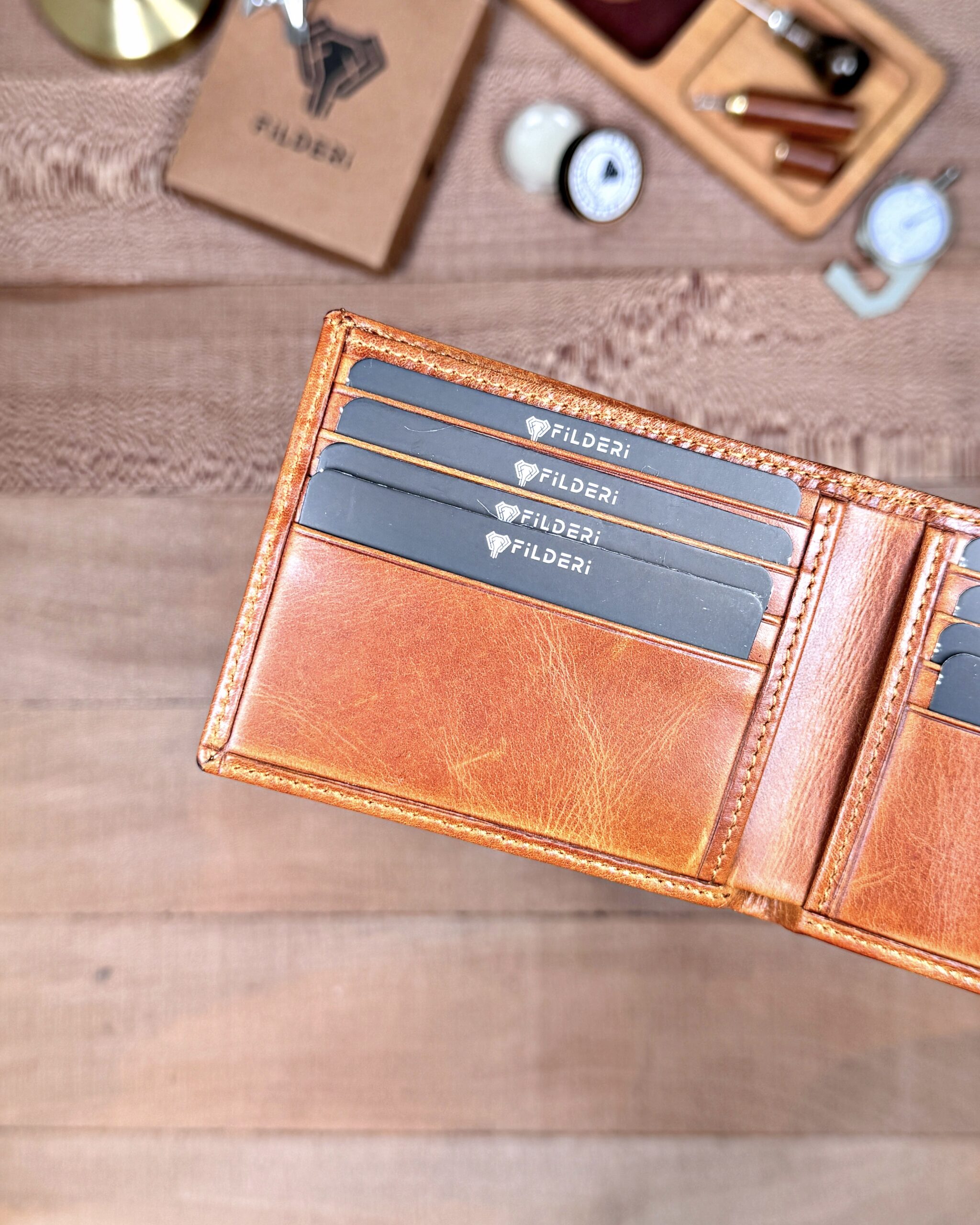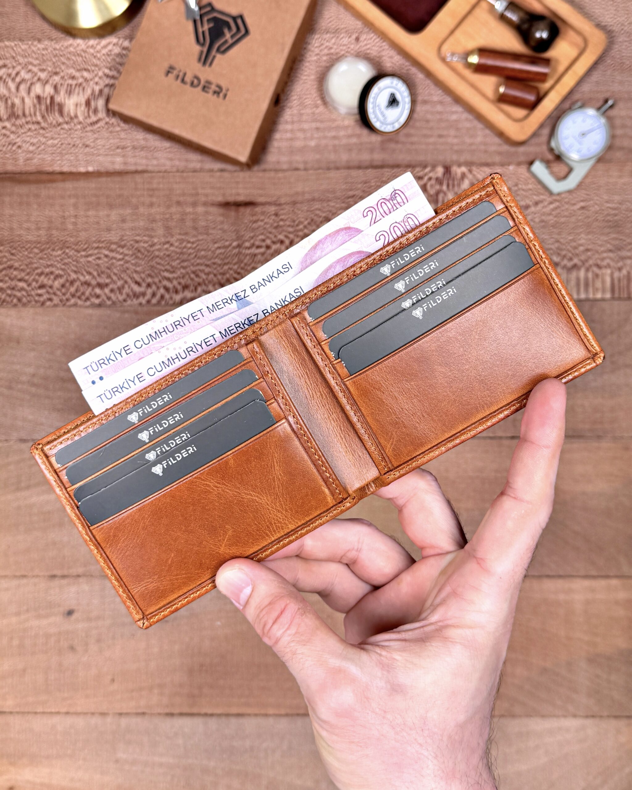 Derisi kaliteli, elde şık duruyor. Yeteri kadar kartlık gözü var, kağıt ve madeni paralar için kullanım kolay, telefon rahat sığıyor.