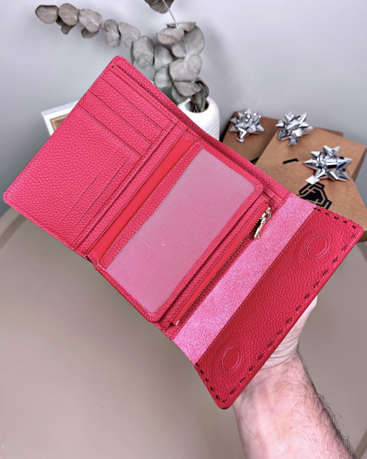 Derisi kaliteli, elde şık duruyor. Yeteri kadar kartlık gözü var, kağıt ve madeni paralar için kullanım kolay, telefon rahat sığıyor.