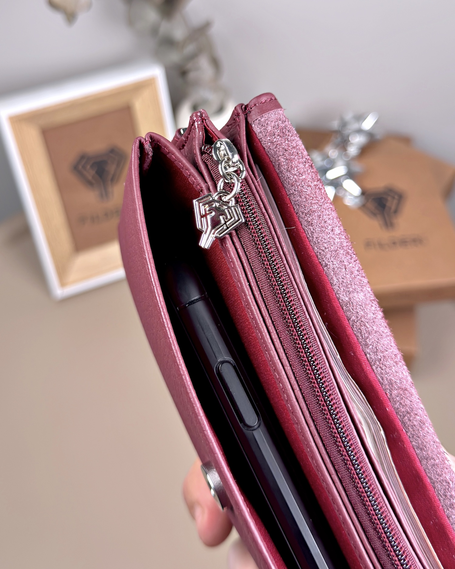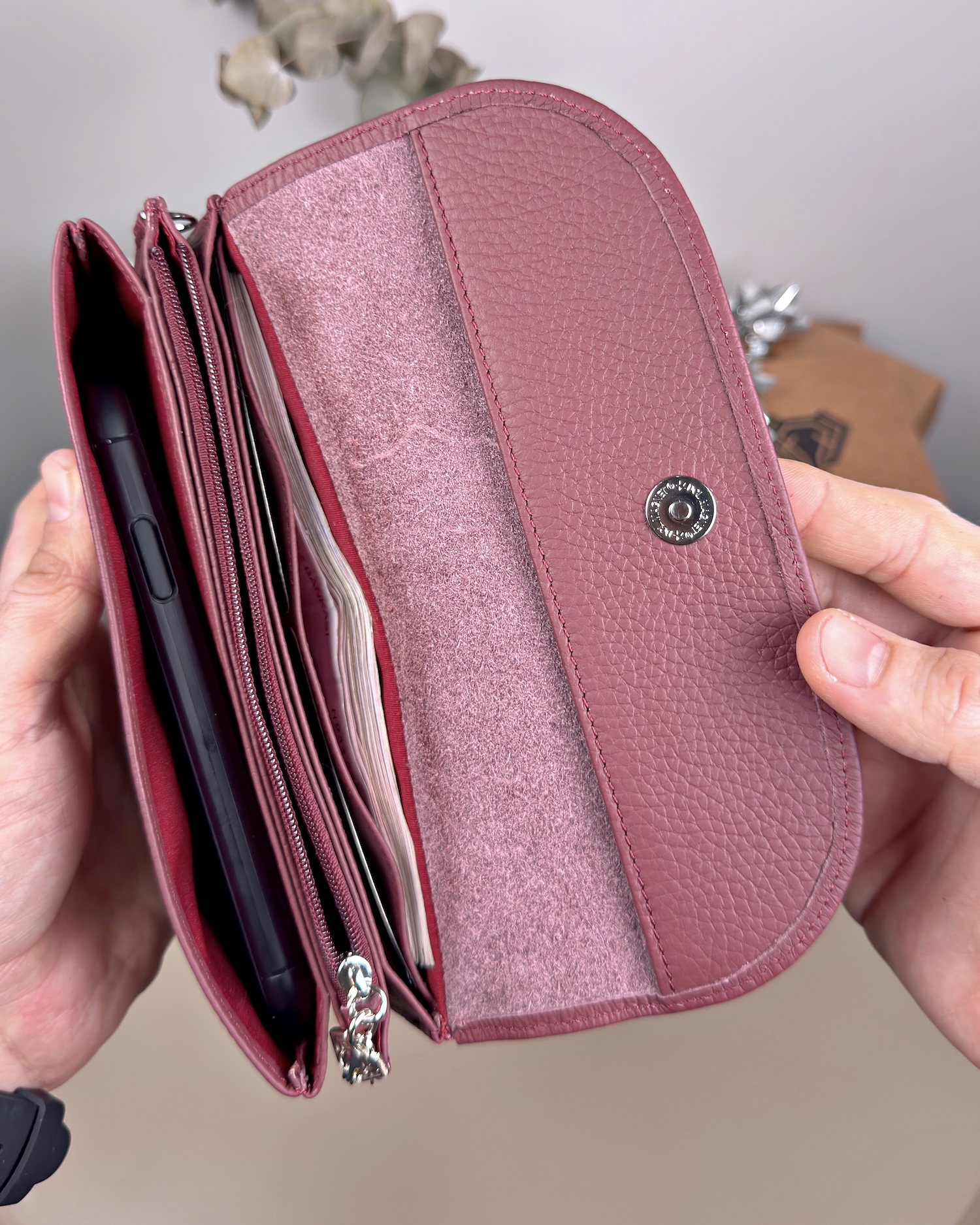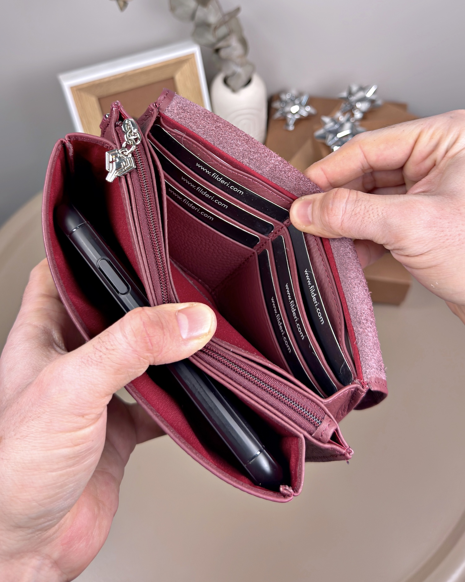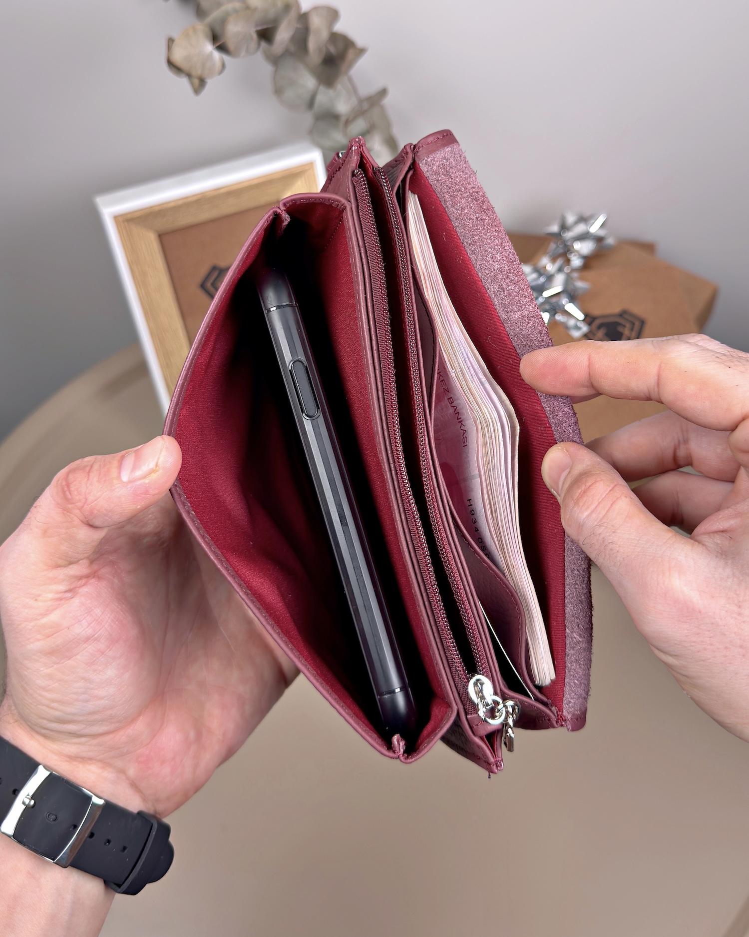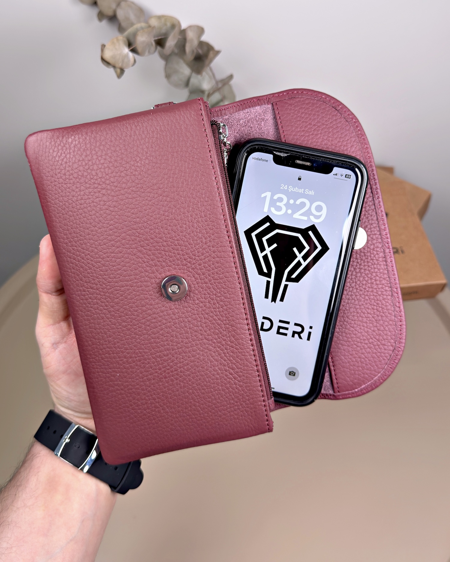 Derisi kaliteli, elde şık duruyor. Yeteri kadar kartlık gözü var, kağıt ve madeni paralar için kullanım kolay, telefon rahat sığıyor.