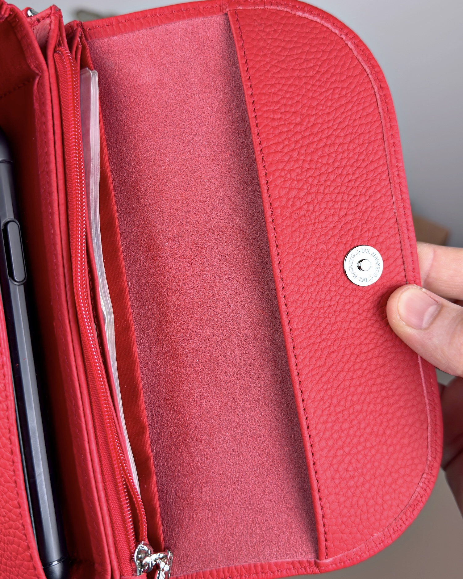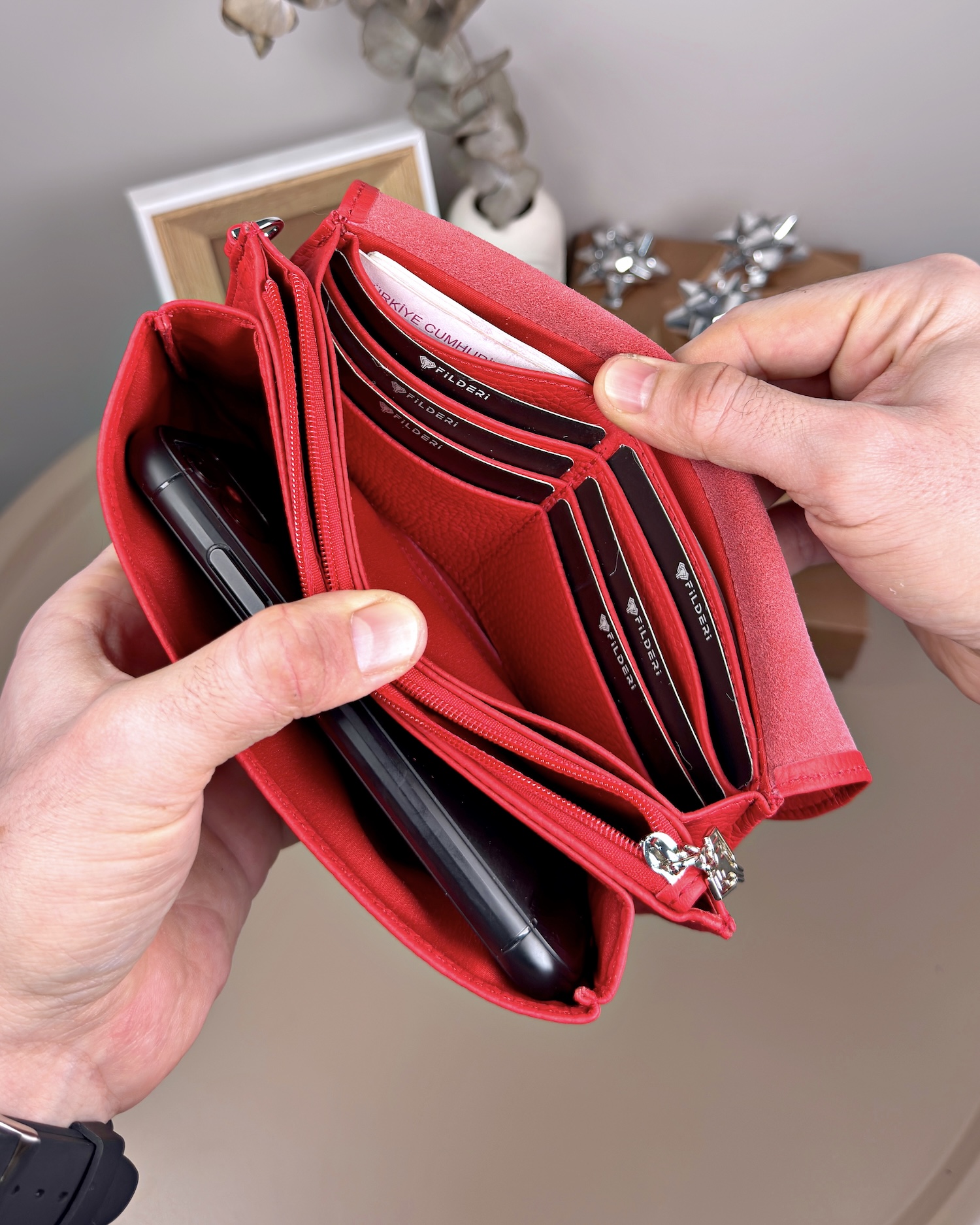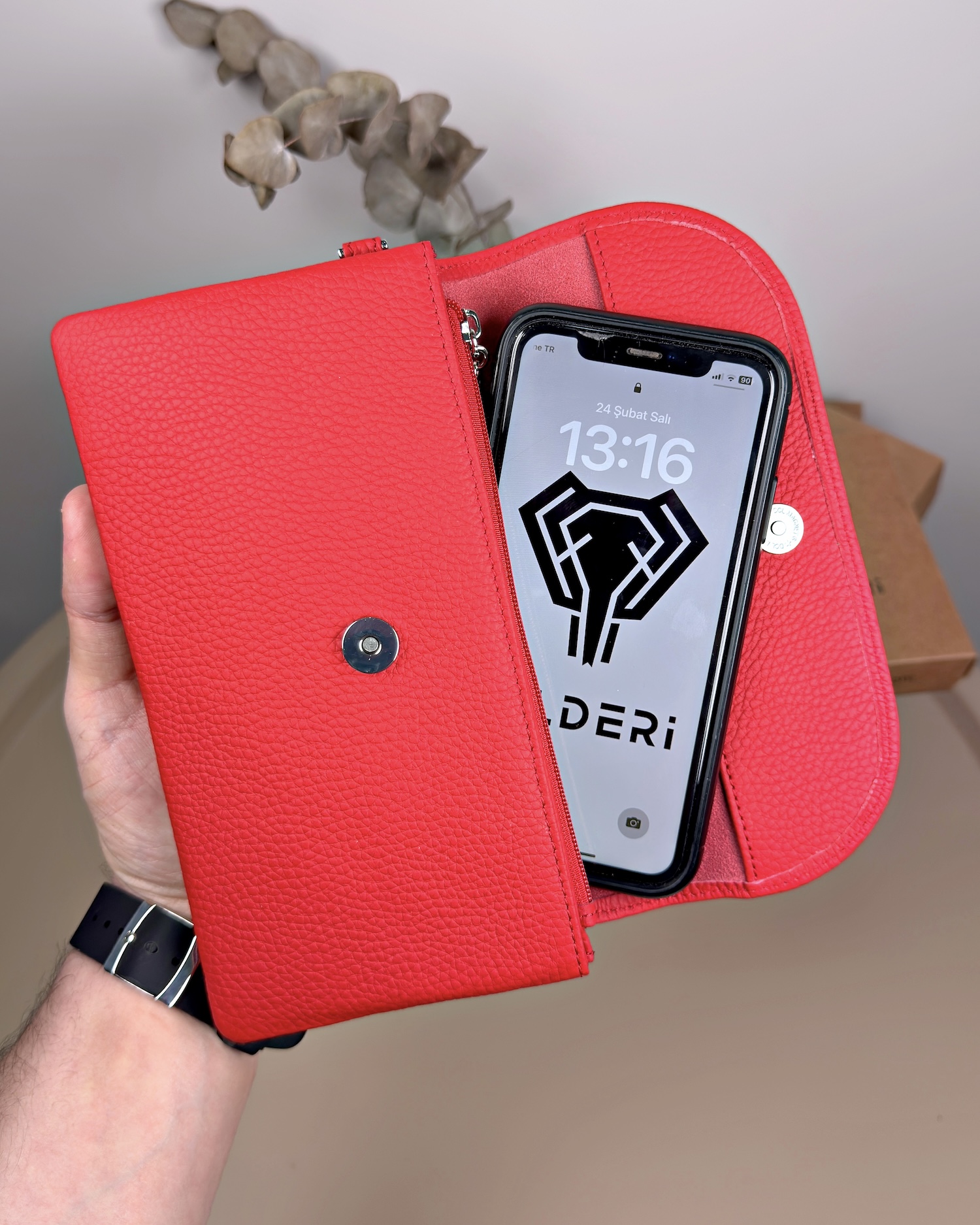 Derisi kaliteli, elde şık duruyor. Yeteri kadar kartlık gözü var, kağıt ve madeni paralar için kullanım kolay, telefon rahat sığıyor.