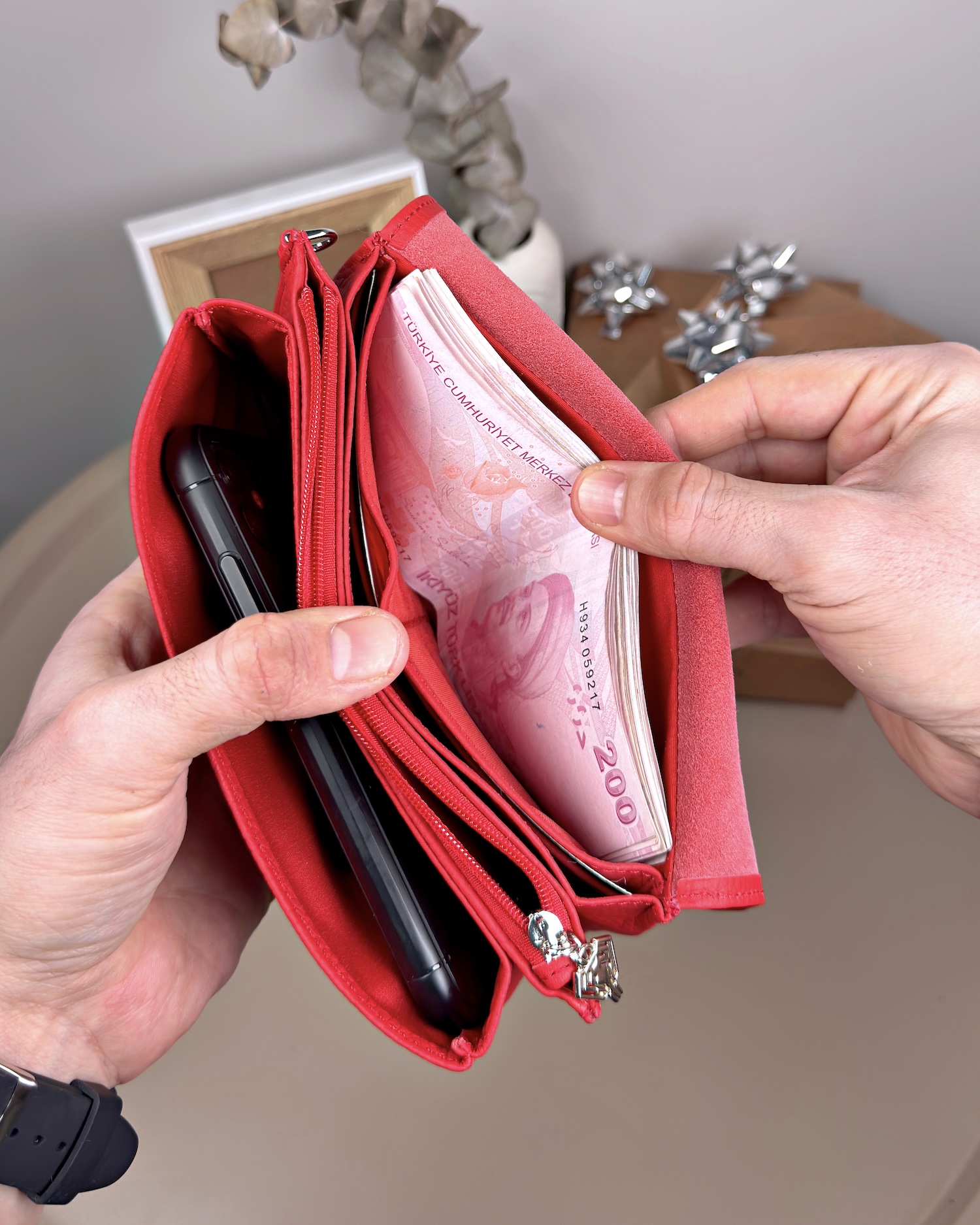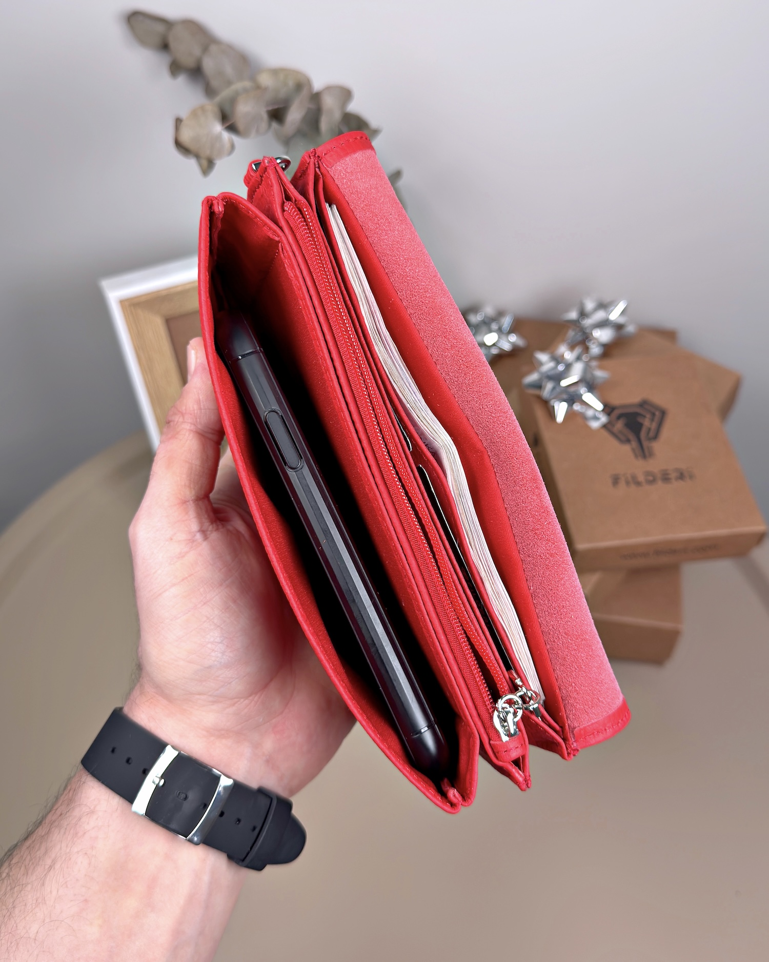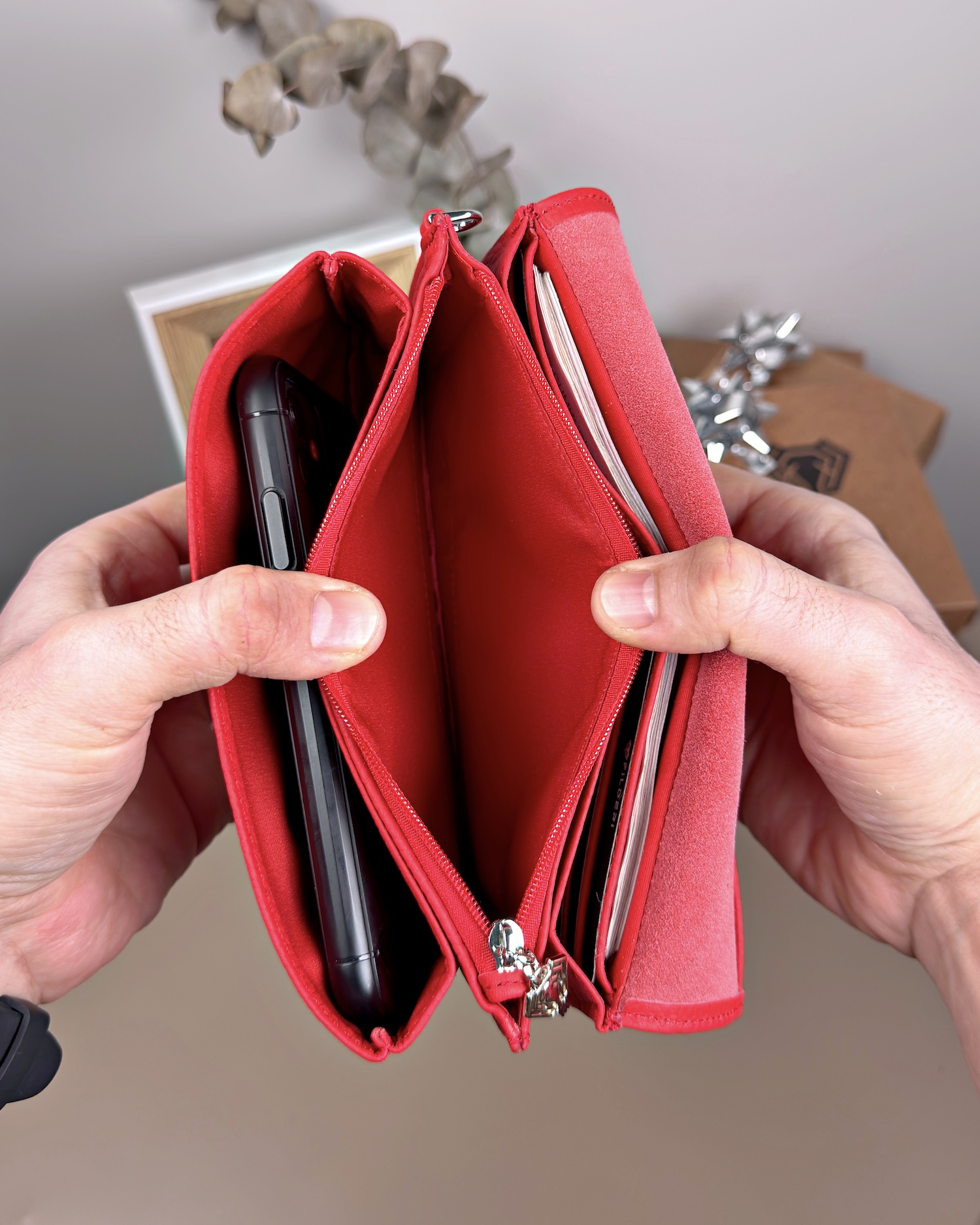 Derisi kaliteli, elde şık duruyor. Yeteri kadar kartlık gözü var, kağıt ve madeni paralar için kullanım kolay, telefon rahat sığıyor.
