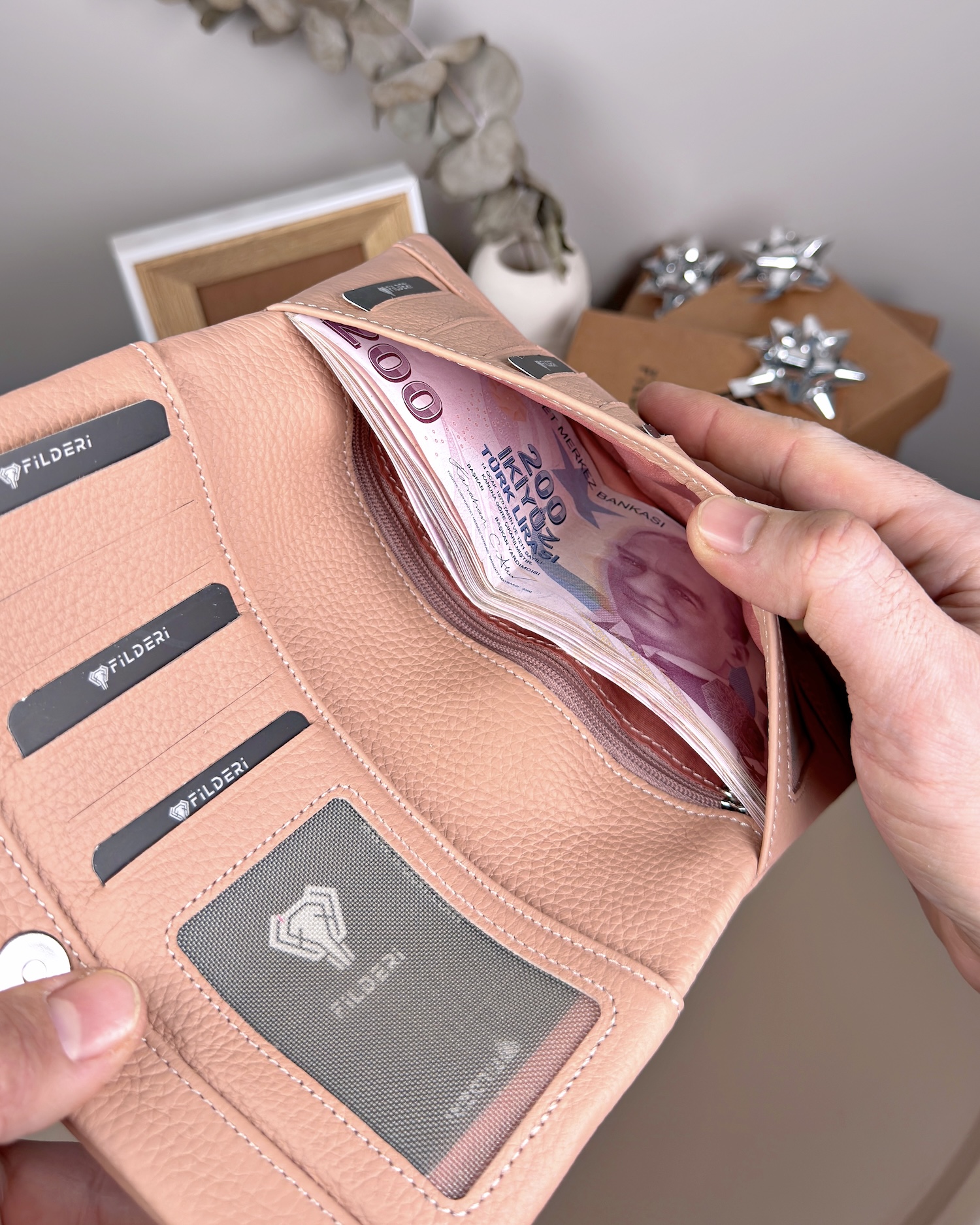 Sipariş vermeden önce önyargılarım vardı .sosyalmeydayadn bubtur seylere pek guvenmemekle birlikte arasirmalar yaptım. Çok güzel yorumlar gördüm. Almaya karar verdim . Ne kadar iyi bişey yaptığımı ürün iki gün sonra elime ulaşıp paketi açıp o deri cüzdanı elime alınca kalitesi kokusu. Kusursuzluğu beni çok etkiledi görselde gorunenenin aynısı fil deriye teşekkürler.