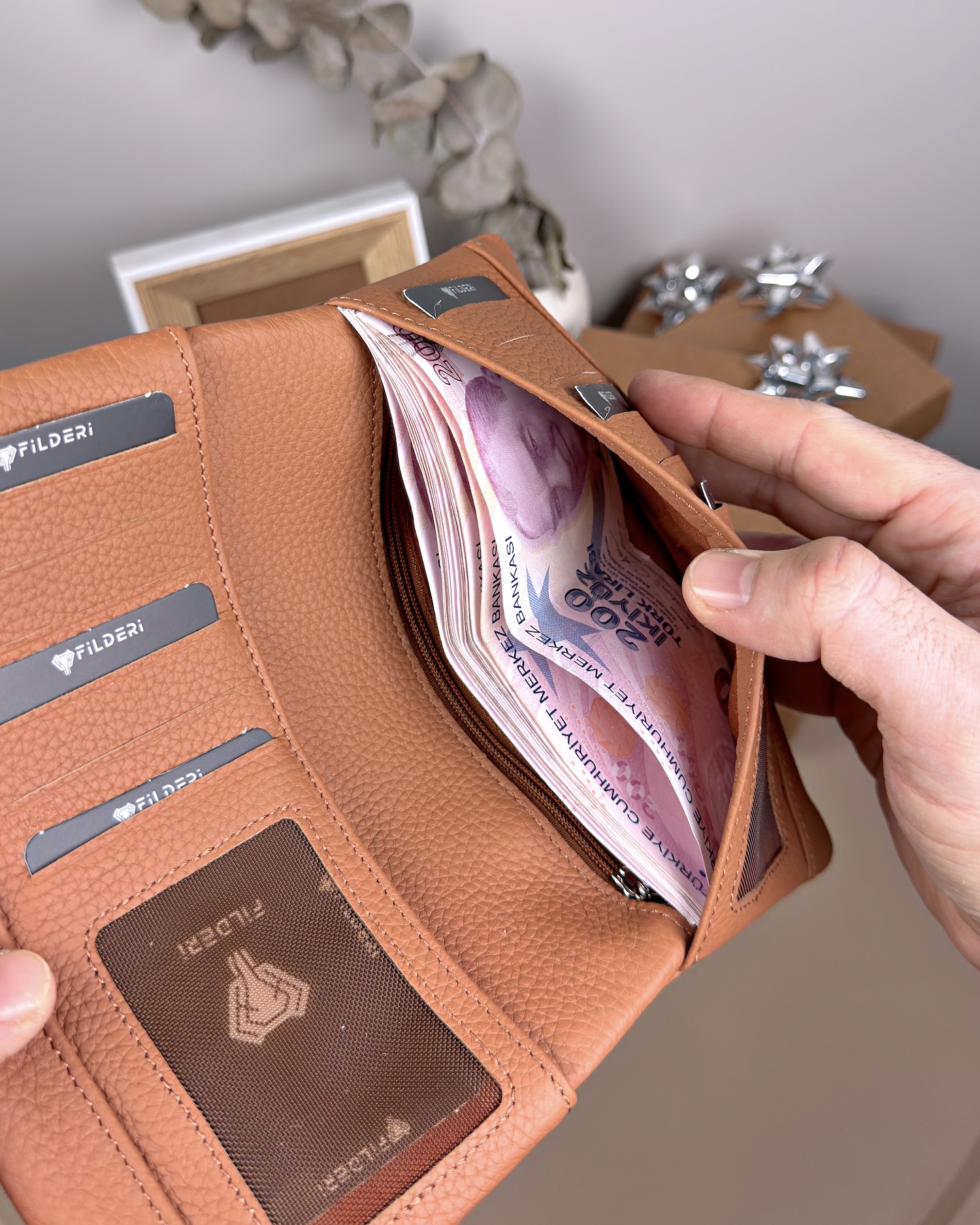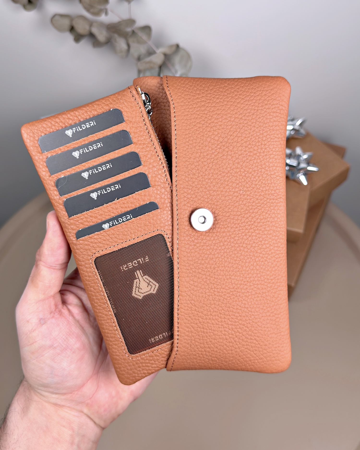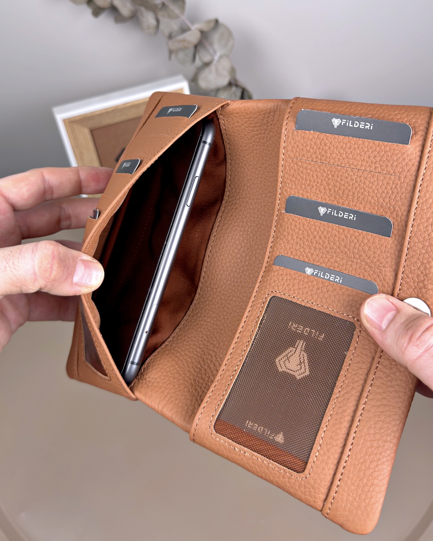 Telefon Bölmeli Cüzdan – Hakiki Deri, Kartlıklı, Taba | 2134