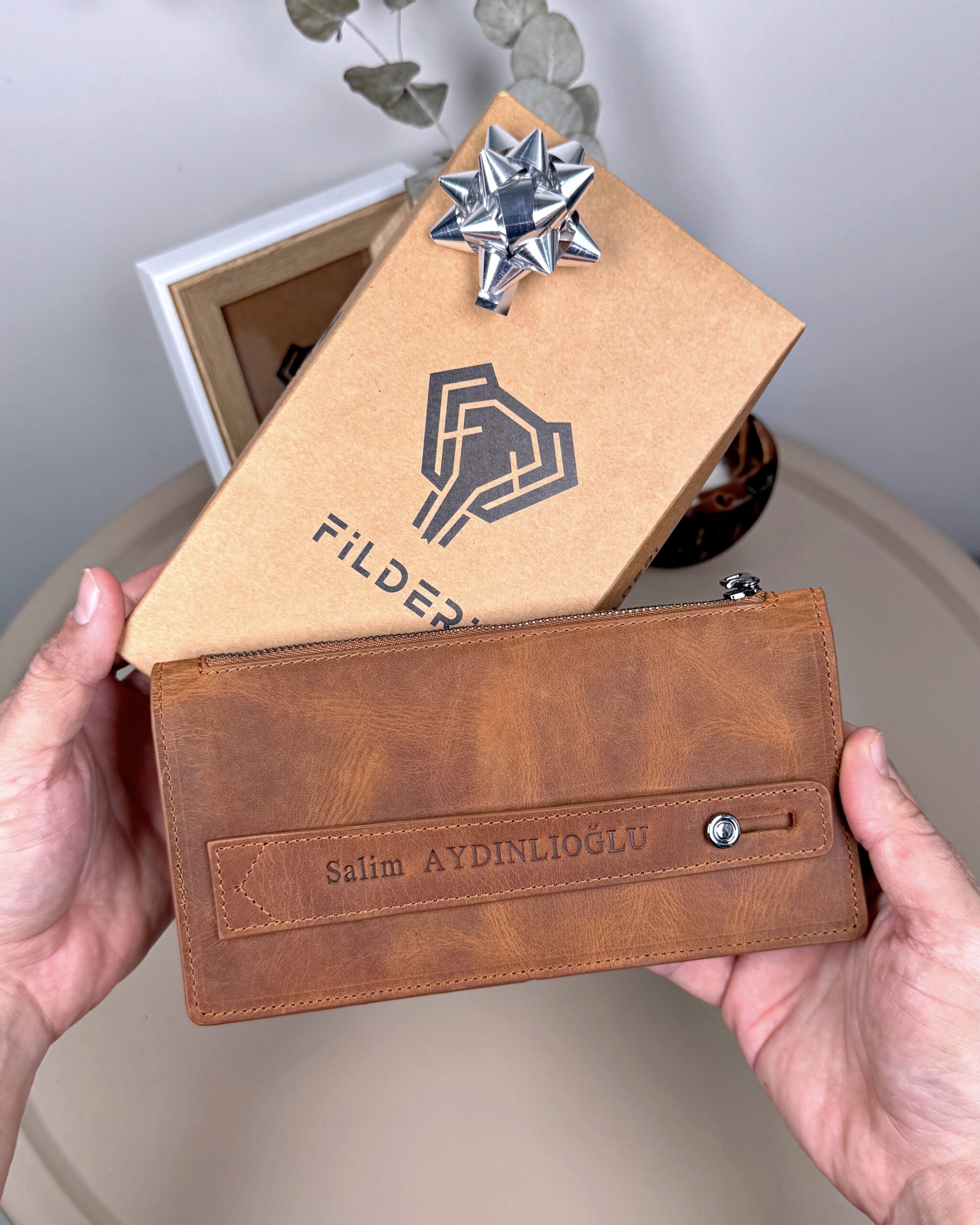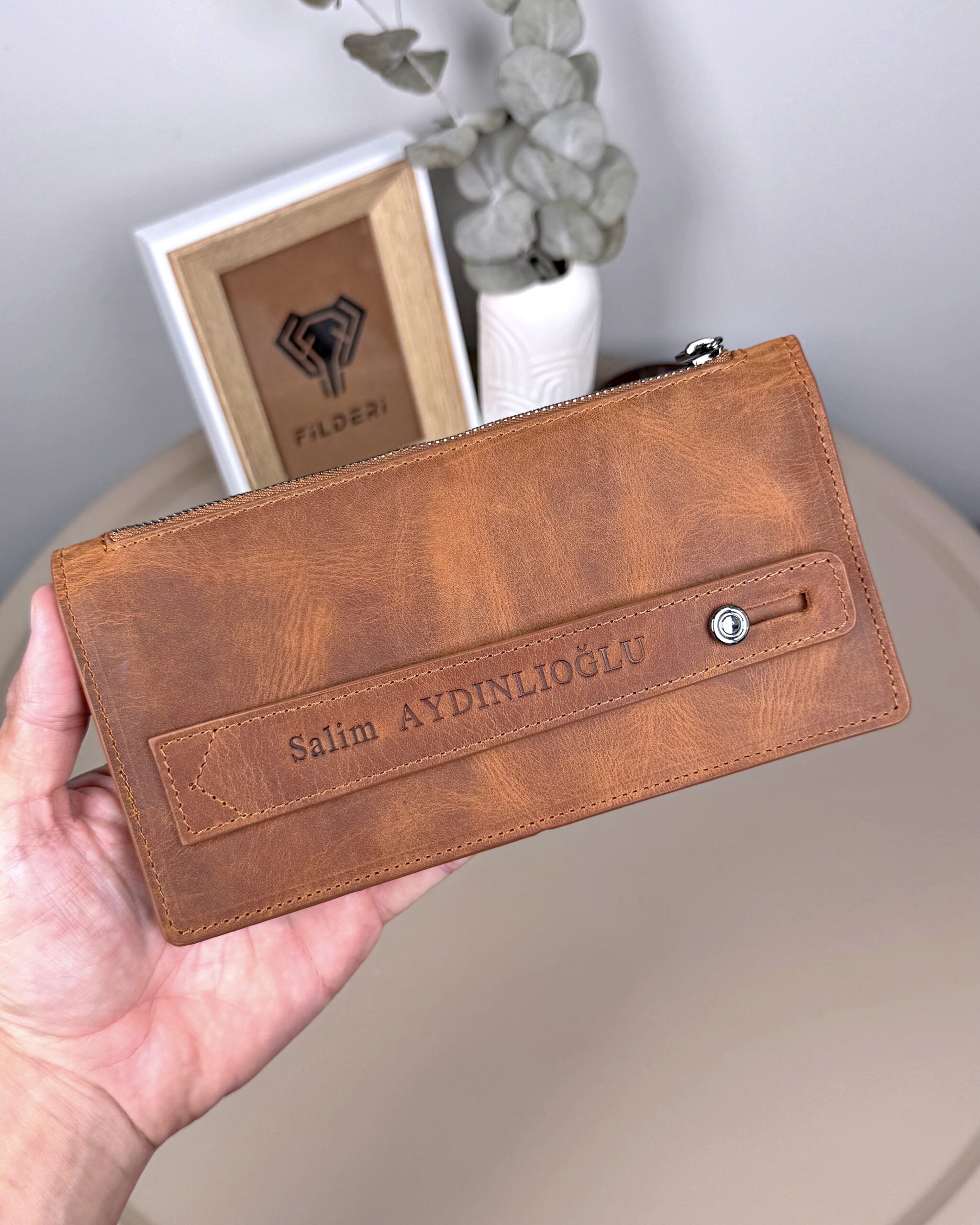 Telefon Bölmeli Portföy – Hakiki Deri Parçalı Tasarım Fındık | 2128